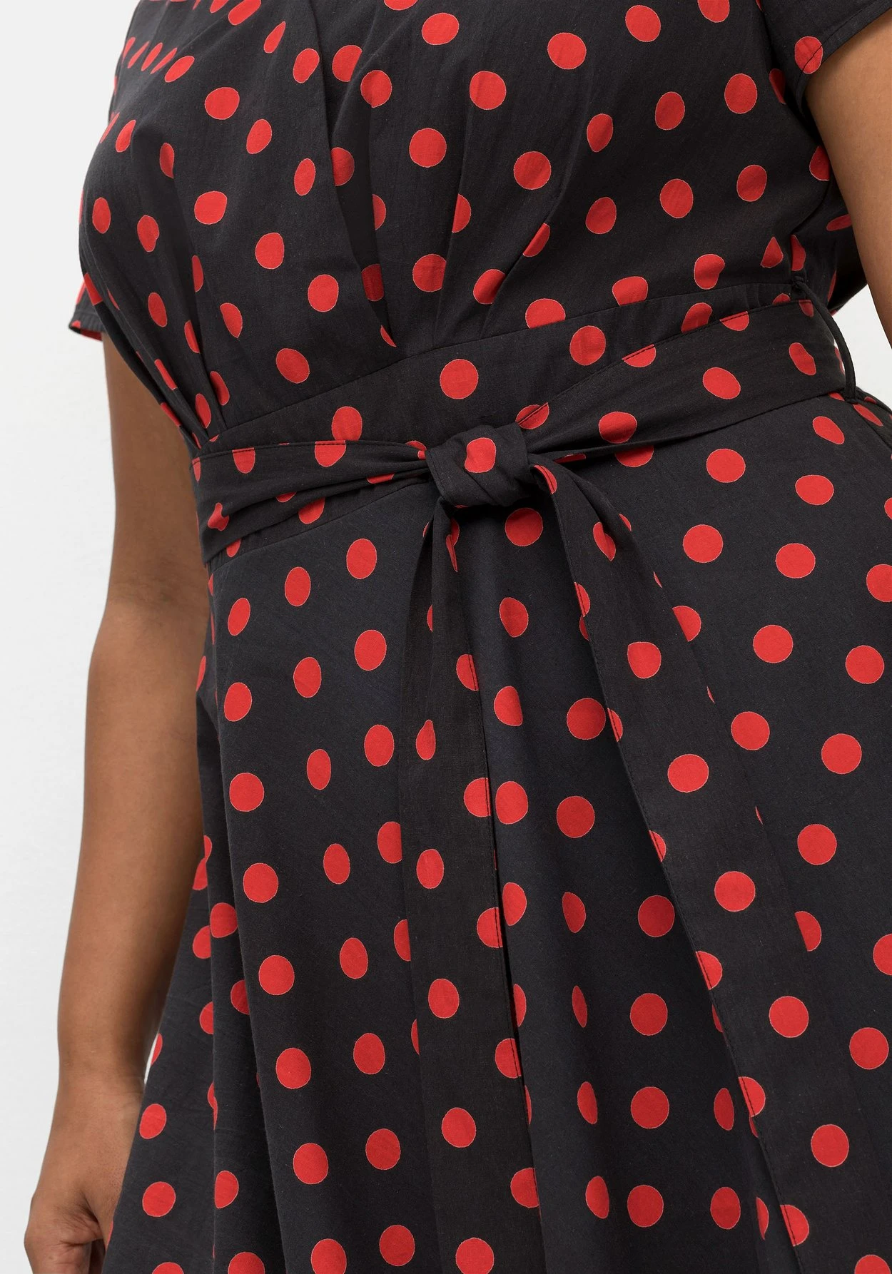 Das Kleid besitzt kurze Ärmel und eine knieumspielende Länge. Durch Taillenband und Gürtel wird die feminine Sanduhrsilhouette des X-Typs perfekt betont, der ausgestellte Schnitt gleicht die V-Figur harmonisch aus.