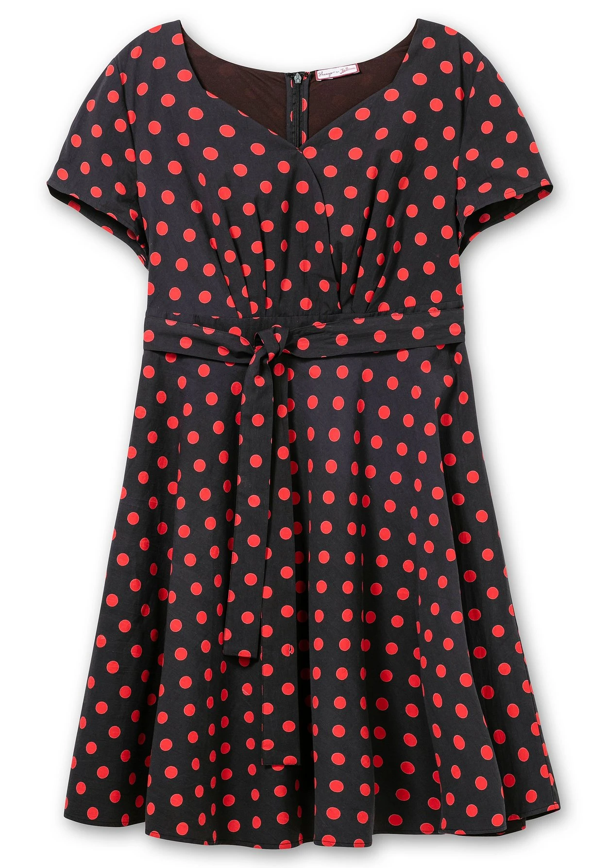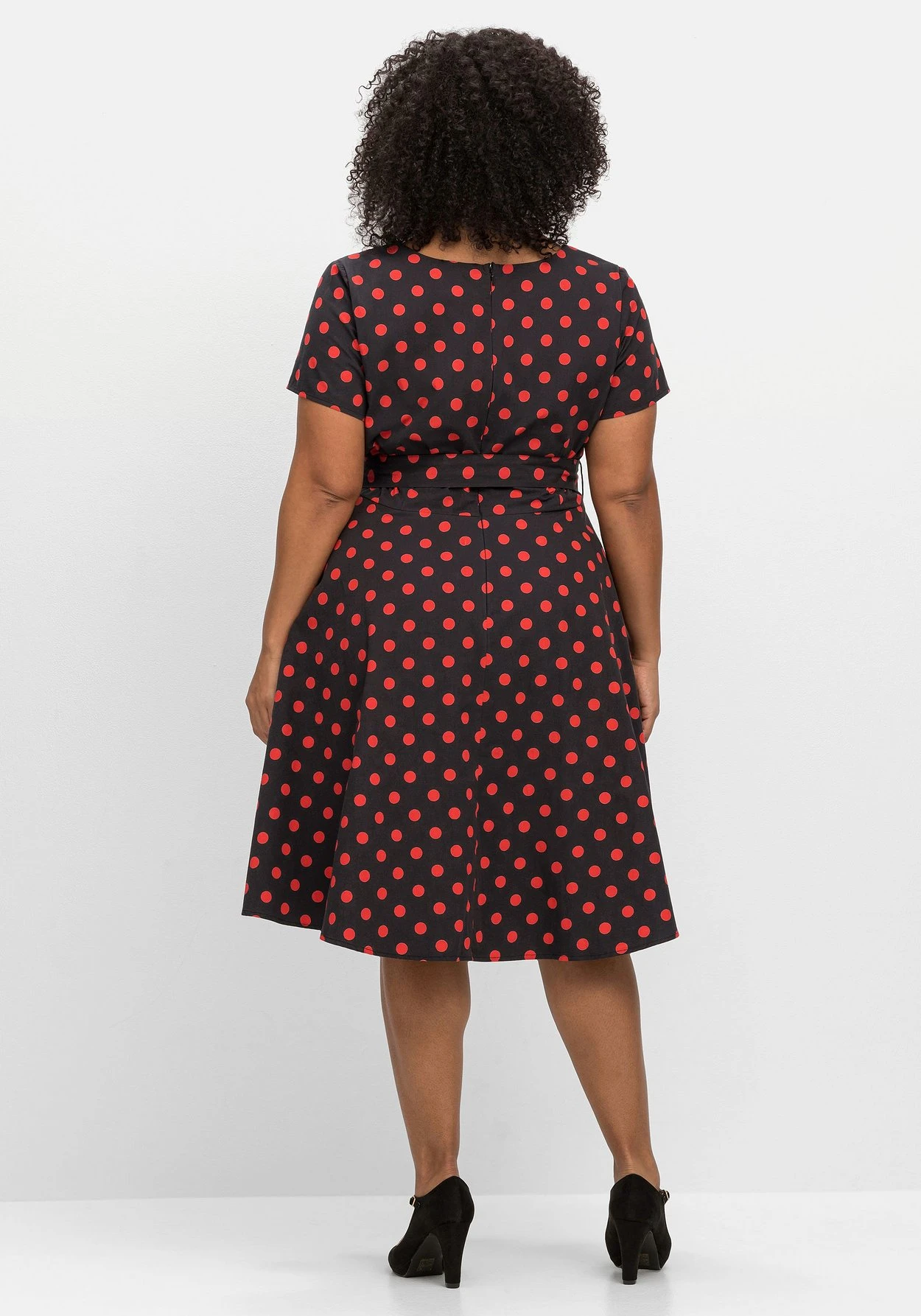 Kleid mit Punkte-Alloverdruck von sheego by Joe Browns. Ganz im Stil der 60er-Jahre zeigt es sich mit einem Oberteil im figurbetonendem Wickelschnitt und einem weit schwingenden Rock. Auch der herzförmige Ausschnitt sorgt für Retro-Charme. Die Taille wird durch Band und Bindegürtel in Szene gesetzt, daran schließt sich ein wunderschön schwingendes Rockteil an. Der nahtfeine Reißverschluss im Rücken macht den Style komplett.