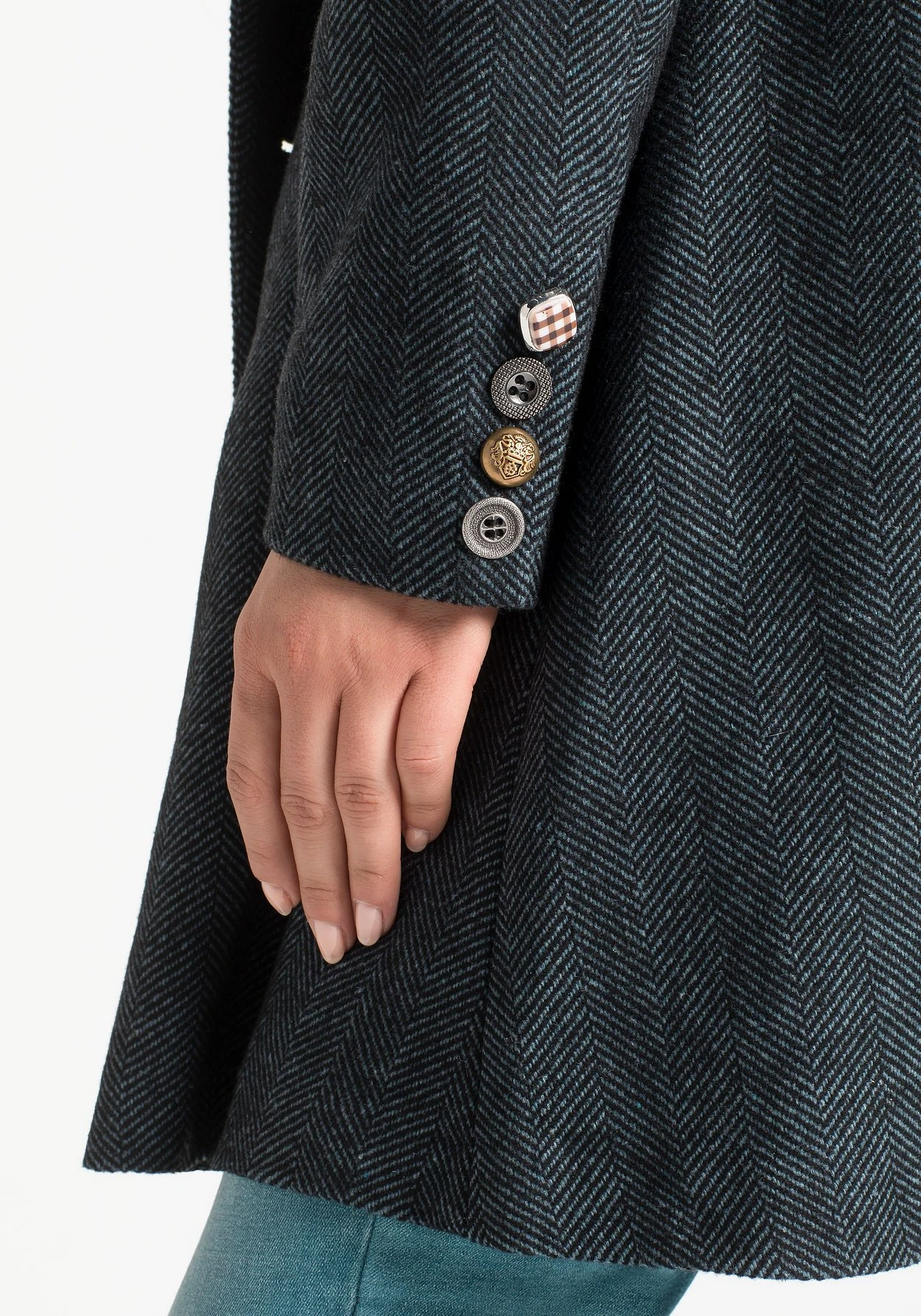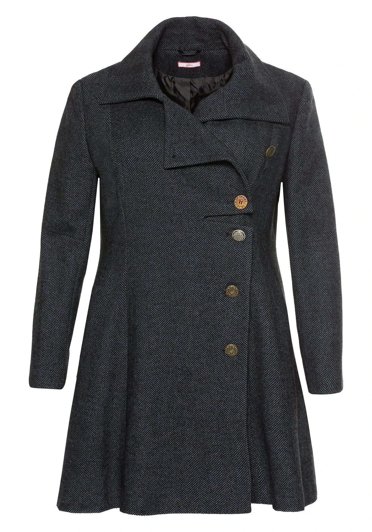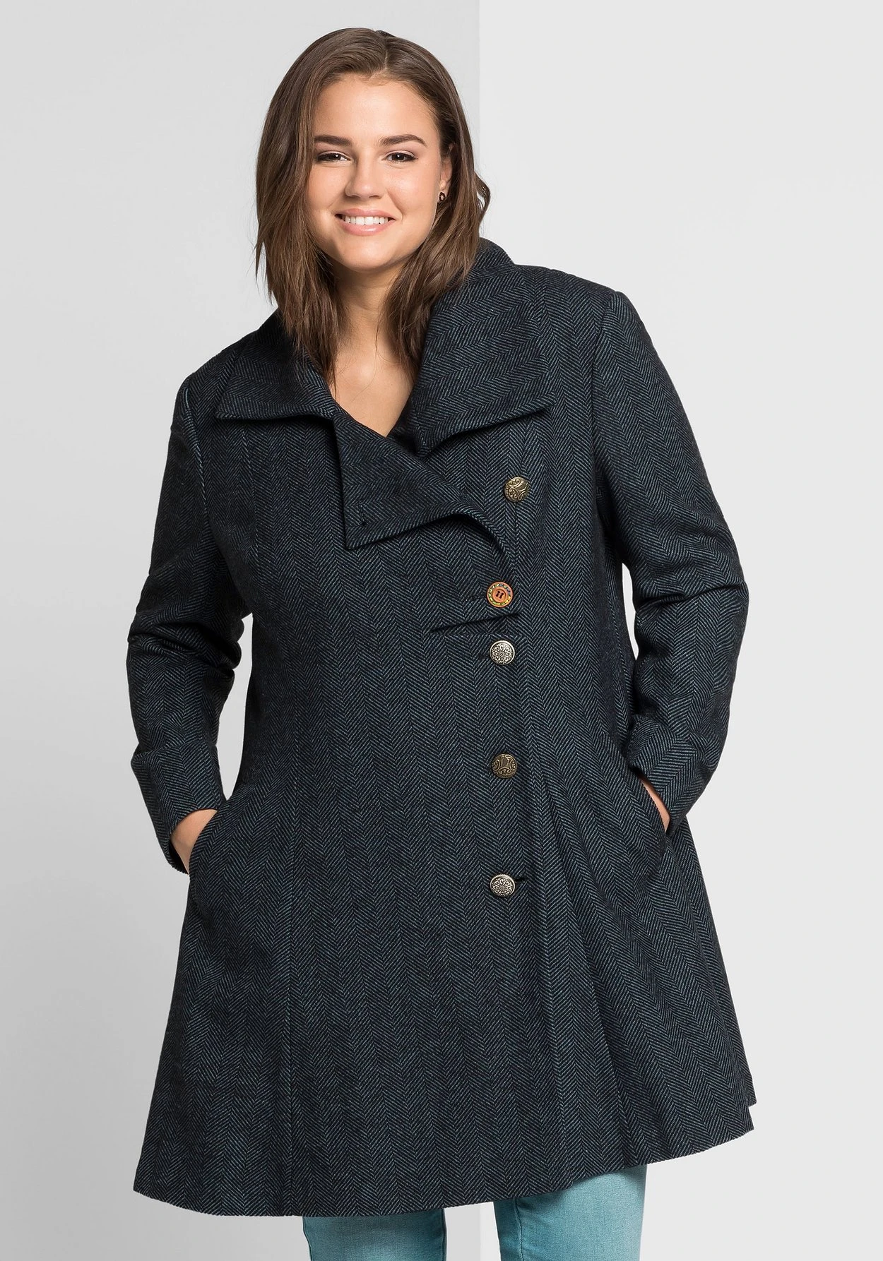 Schlicht aber alles andere als langweilig präsentiert sich der Kurzmantel von sheego by Joe Browns. Sowohl Revers als auch die Knopfleiste sind asymmetrisch angeordnet. Verschiedene, aufwendig verzierte Knöpfe machen den Mantel zu einem modischen Blickfang. Die spitz zulaufenden Blenden im Rückenteil und die Ärmel sind ebenfalls mit Zierknöpfen bestückt. An den Seiten befinden sich schräge Eingrifftaschen.