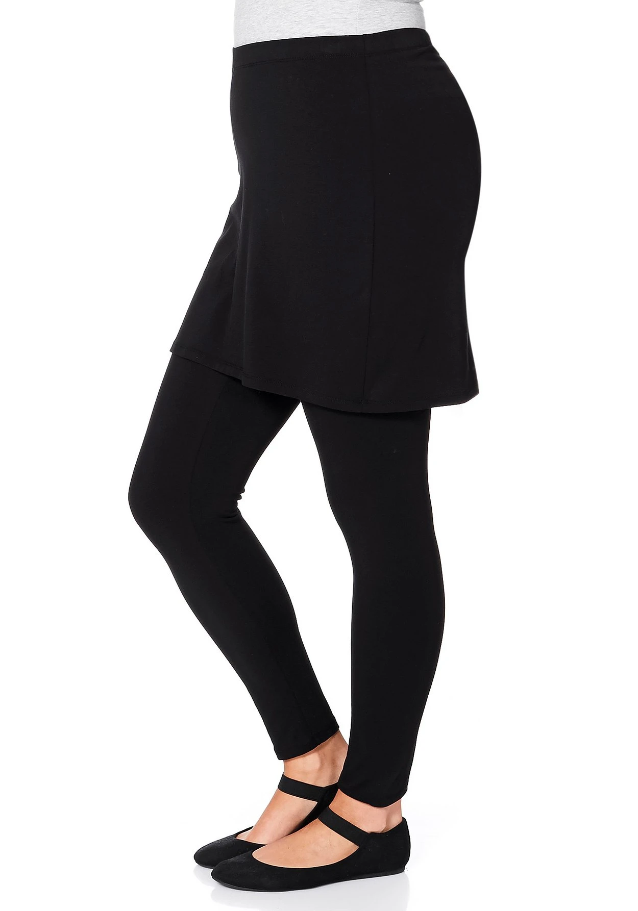 Die schmalen Leggings betonen die Beine, der kurze Rock fällt locker über Po und Hüfte.