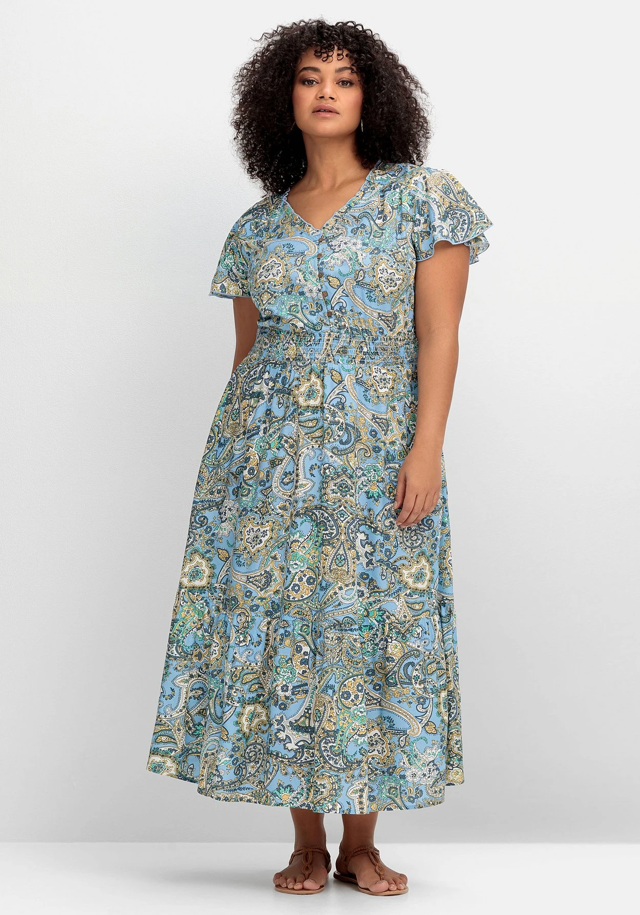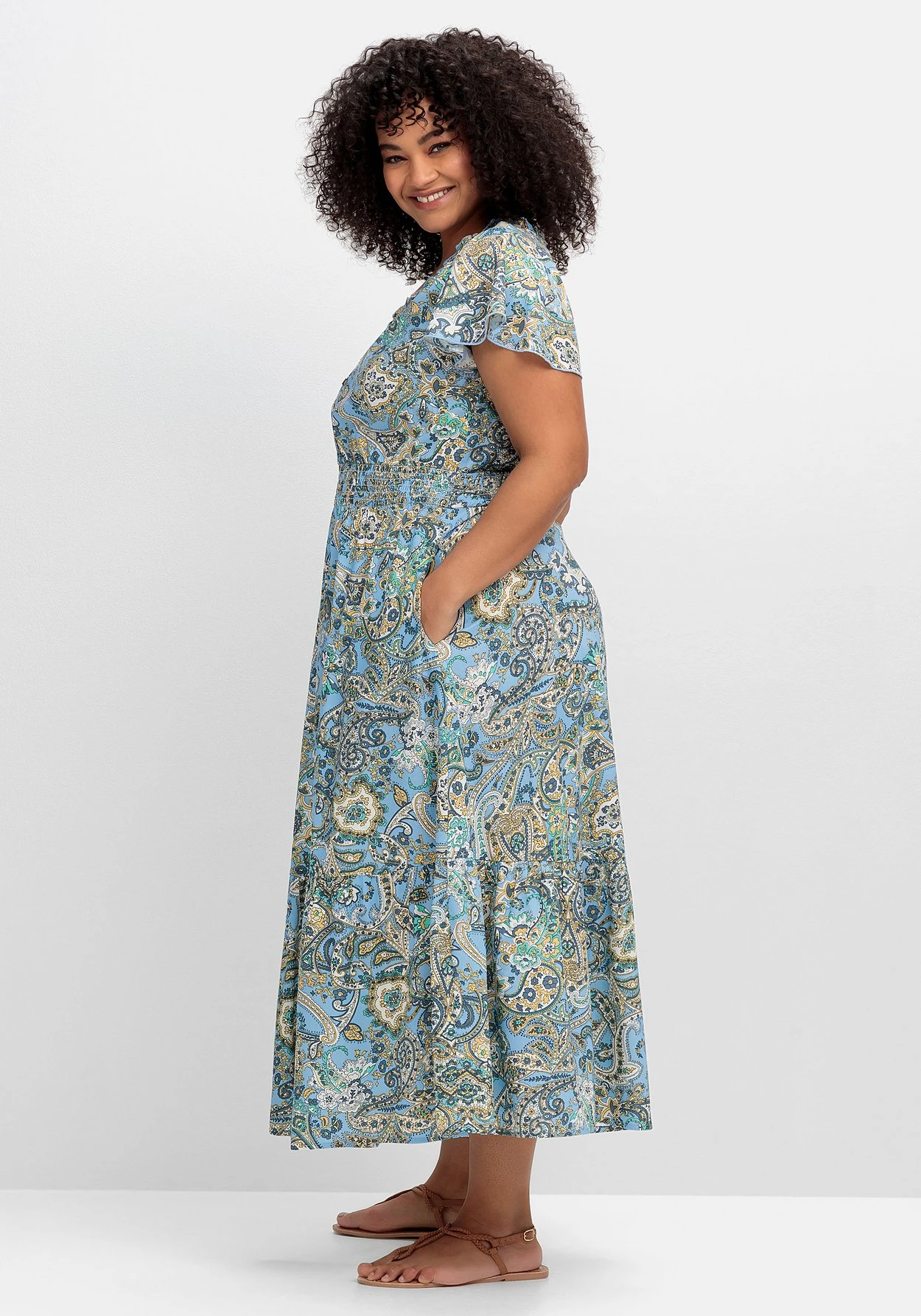 Maxikleid von sheego by Joe Browns. Der großformatige Paisleydruck sorgt hier für den besonderen Look. Die luftigen Flügelärmel und die Rüsche am V-Ausschnitt ergänzen den femininen Auftritt. Dazu kommen die vorverlegte, leicht gekräuselte Schulternaht und die gekräuselte Rückenpasse. Das Kleid ist mit einer kurzen Knopfleiste gearbeitet, praktisch sind die schräg eingesetzten, nahtfeinen Eingrifftaschen. Ein gesmokter Gummizug betont die Taille und trägt sich gleichzeitig sehr bequem. Darunter schließt sich das leicht ausgestellte und weit schwingende Rockteil an. Ein Volant am Saum wird zum verspielten Finish.