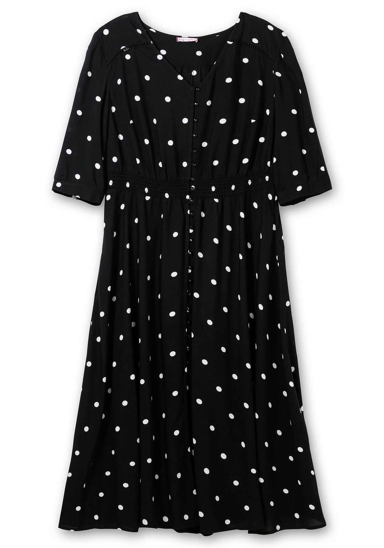 Maxikleid mit Punktemuster von sheego by Joe Browns. Das lange Kleid ist mit einem streckenden V-Ausschnitt gearbeitet, die 3/4-langen Ärmel können in der Weite verstellt werden. Hochwertige Crochet-Spitze ziert den Schulterbereich, auch die Knopfleiste mit Schmuckknöpfen fällt ins Auge. Die Taille wird durch den gesmokten, leicht angekräuselten Gummizug geschickt betont. Daran schließt sich ein ausgestelltes, weit schwingendes Rockteil an und macht den feminin-verspielten Look komplett.