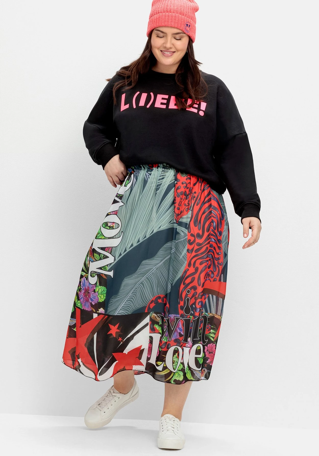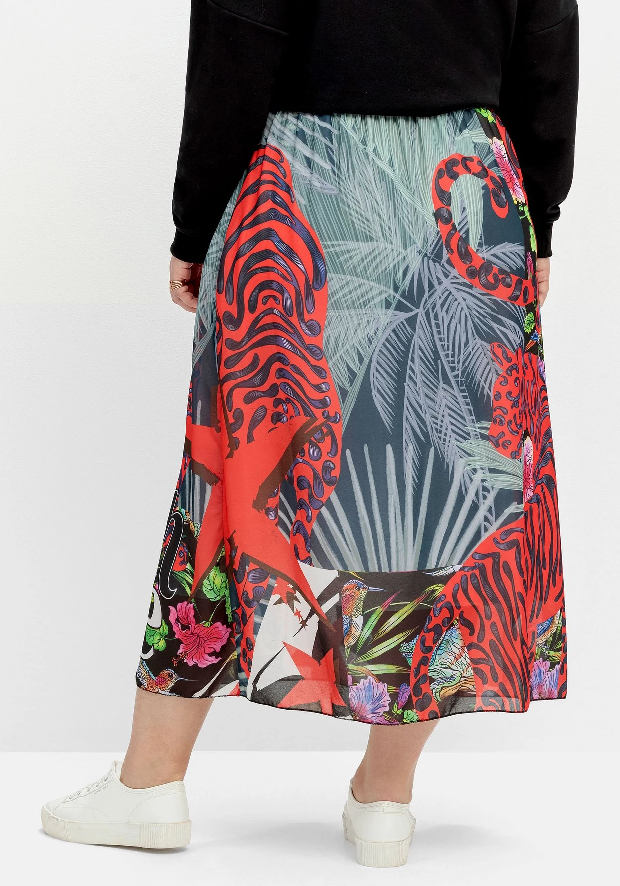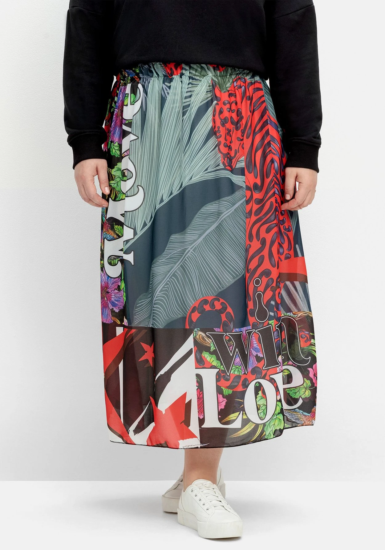 Maxirock in Chiffon-Qualität von sheego loves miss goodlife. Der wunderschöne Mix aus Tiger- und Dschungelprint wird mit Love Vibes-Botschaften stilvoll aufgelockert. Durch den elastischen Formbund sitzt der Rock superbequem, seitliche Eingrifftaschen runden den Look lässig ab.