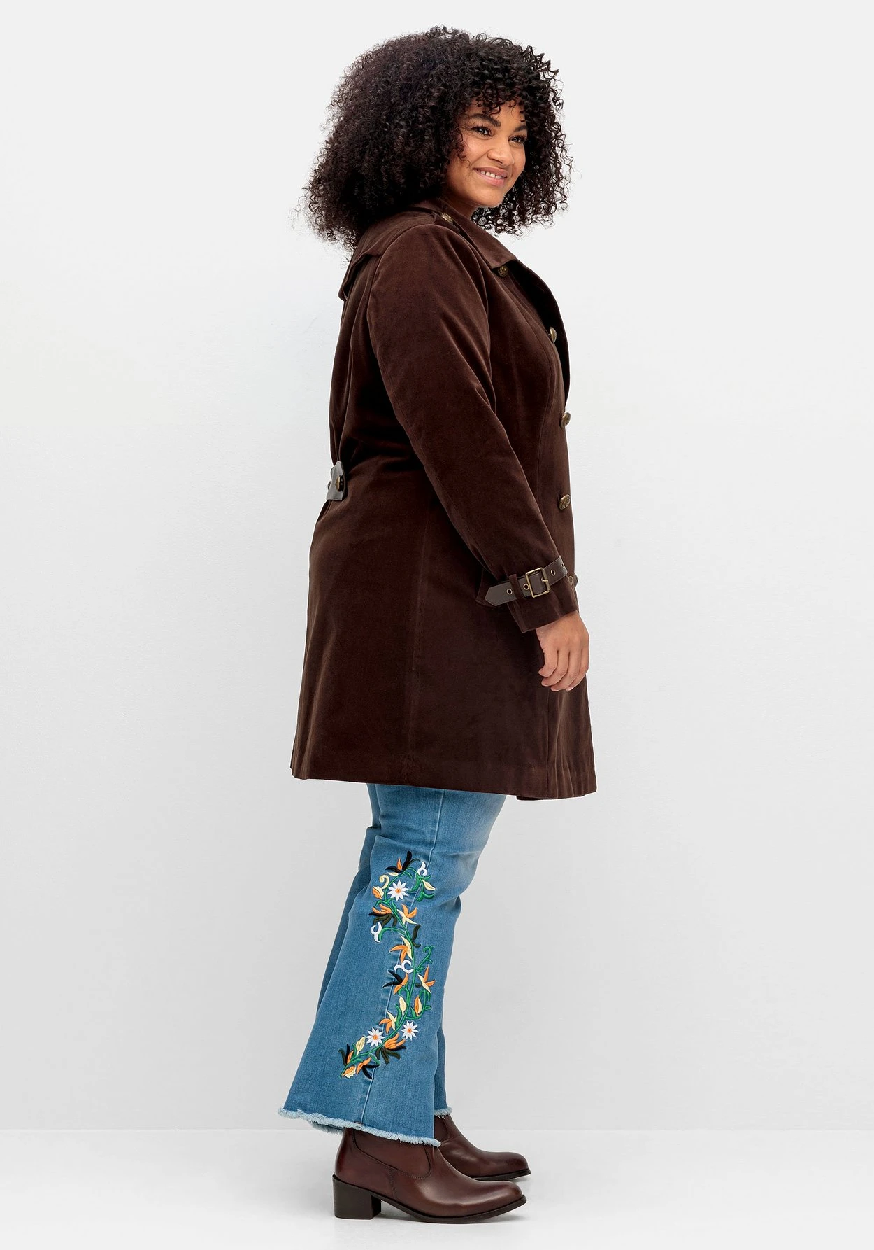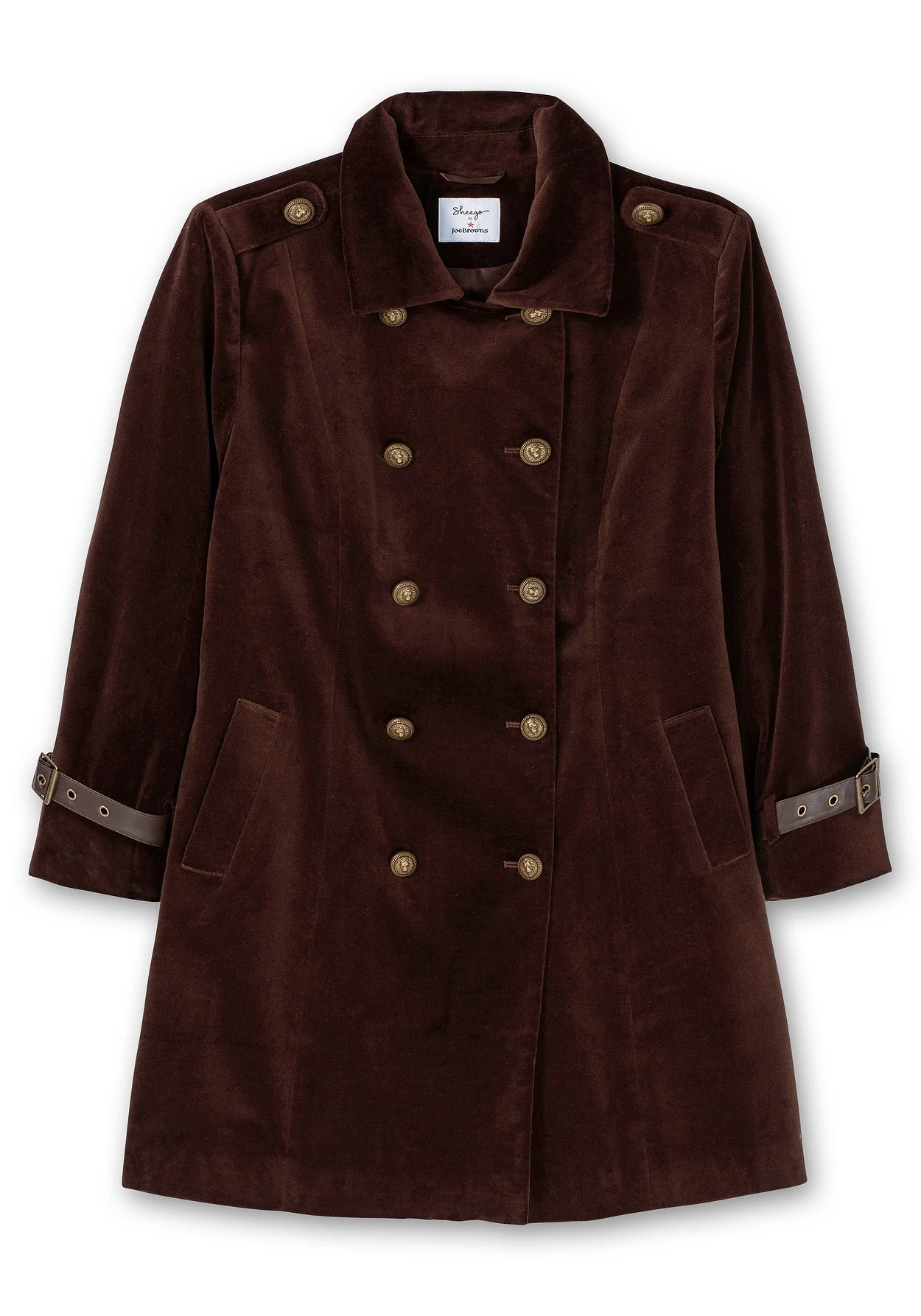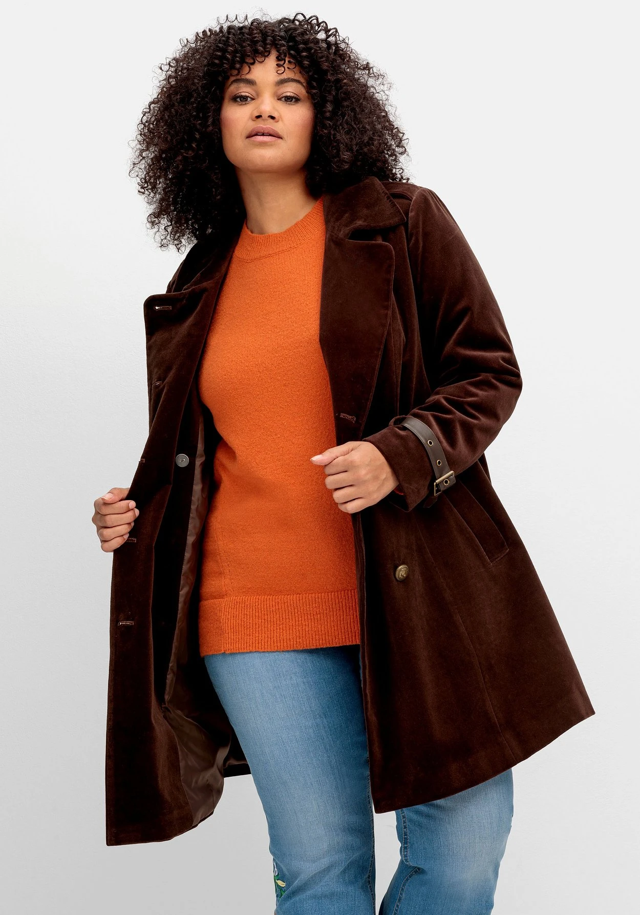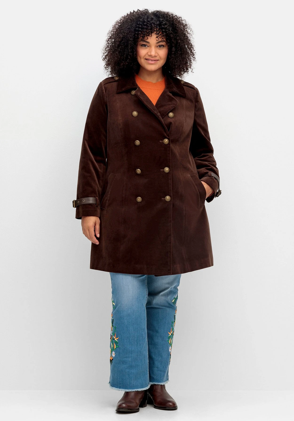 Kurzmantel in Samtoptik von sheego by Joe Browns. Die doppelreihige Knopfleiste fällt durch aufwendig geprägte Knöpfe in Metalloptik ins Auge, praktisch ist der innen eingearbeitete Gegenknopf. Auch der knöpfbare Umlegekragen und die Riegel auf der Schulter unterstreichen den markanten Utility-Look. Einen spannenden Kontrast zur samtigen Oberfläche setzen die Ärmelschlaufen und der Riegel in Lederoptik im Rücken. Die schrägen Eingrifftaschen werden durch Leisten betont.