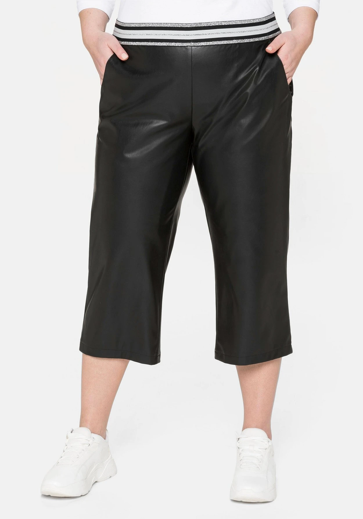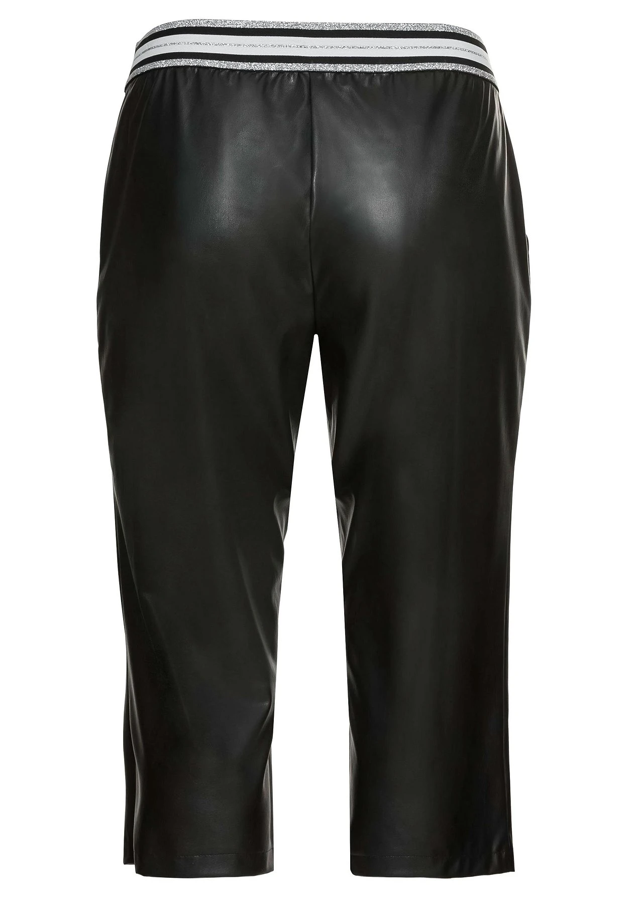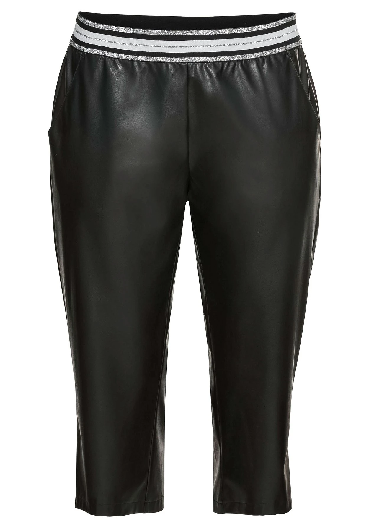 3/4-Hose in Lederoptik. Auch der Gummibund wird durch die glitzernden Streifen zum modischen Highlight. Seitliche Eingrifftaschen ergänzen den Look der Hose.
