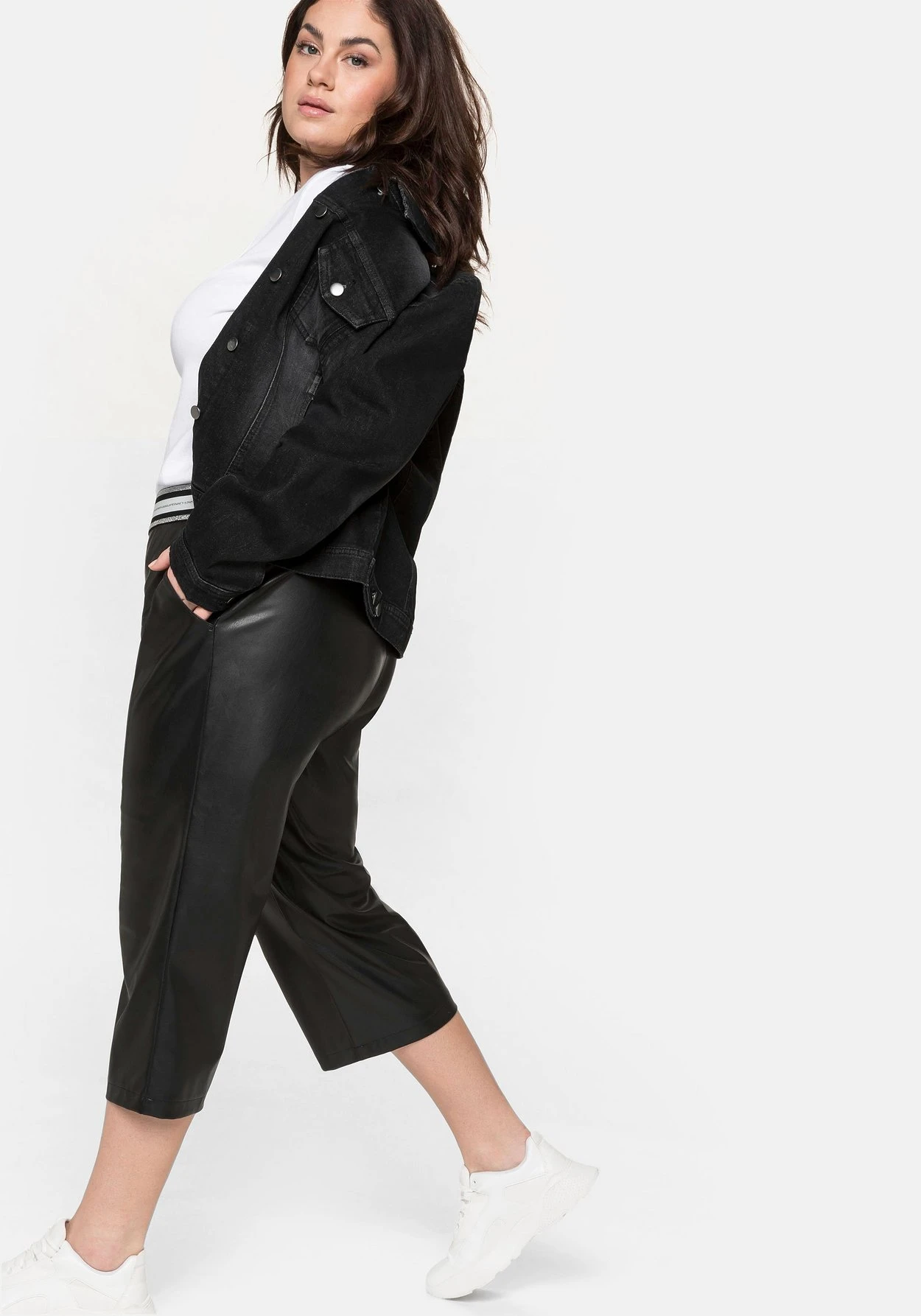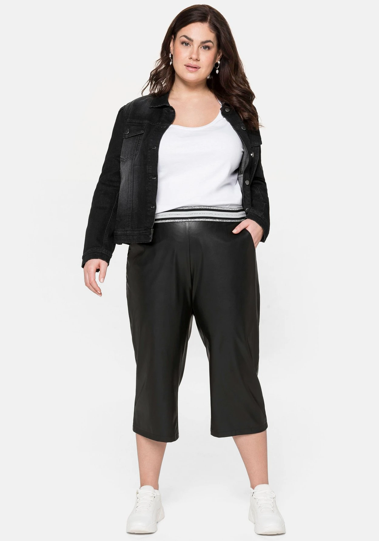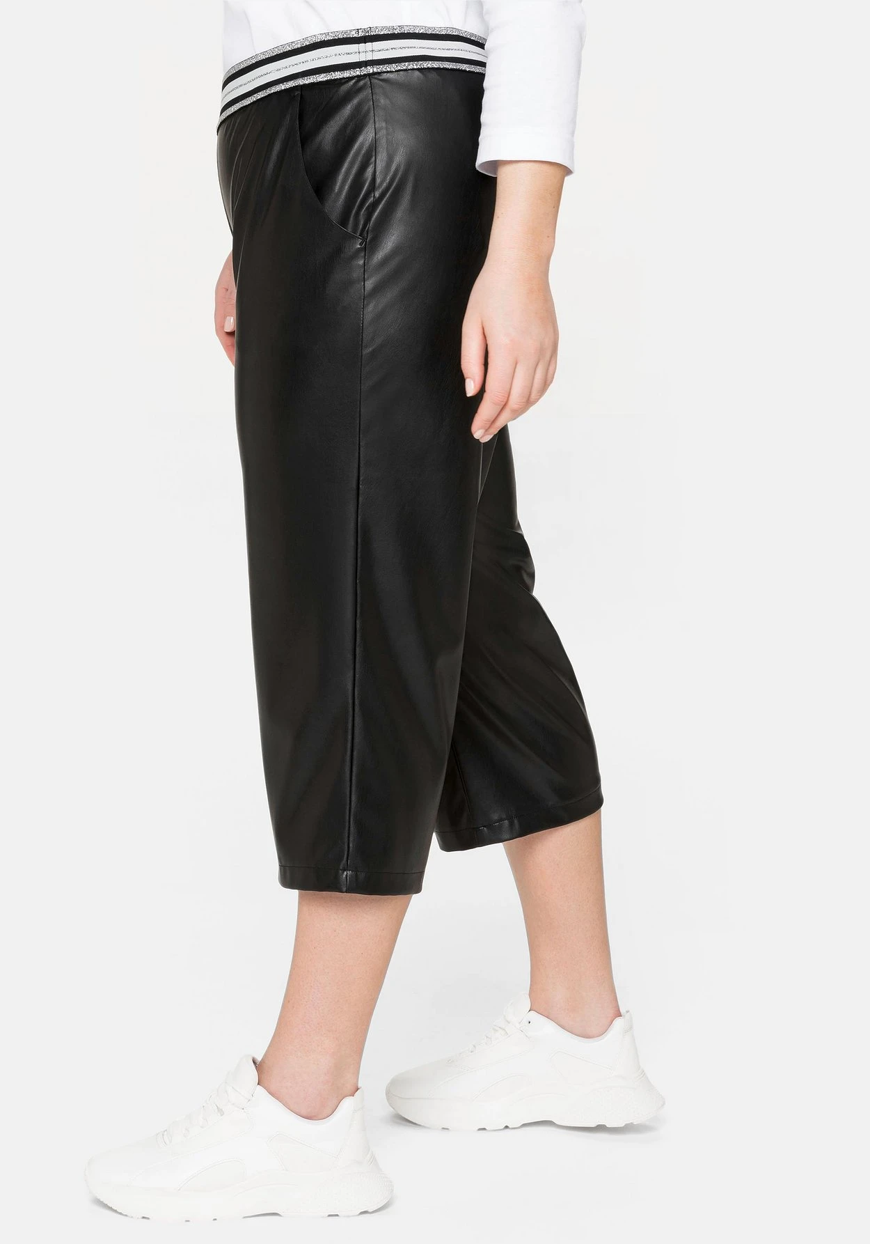 3/4-Hose in Lederoptik. Auch der Gummibund wird durch die glitzernden Streifen zum modischen Highlight. Seitliche Eingrifftaschen ergänzen den Look der Hose.