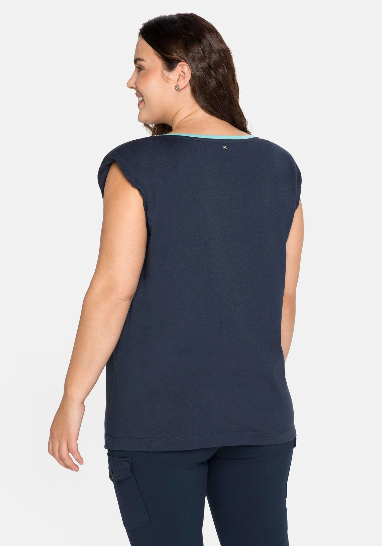 Shirt in ärmelloser Form. Die modisch überschnittenen Schultern erhalten durch dezente Schulterpolster mehr Kontur. Dekoratives Detail ist der kontrastfarben abgesetzte Rundhalsausschnitt.