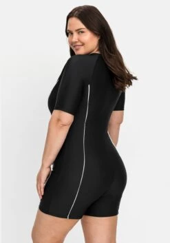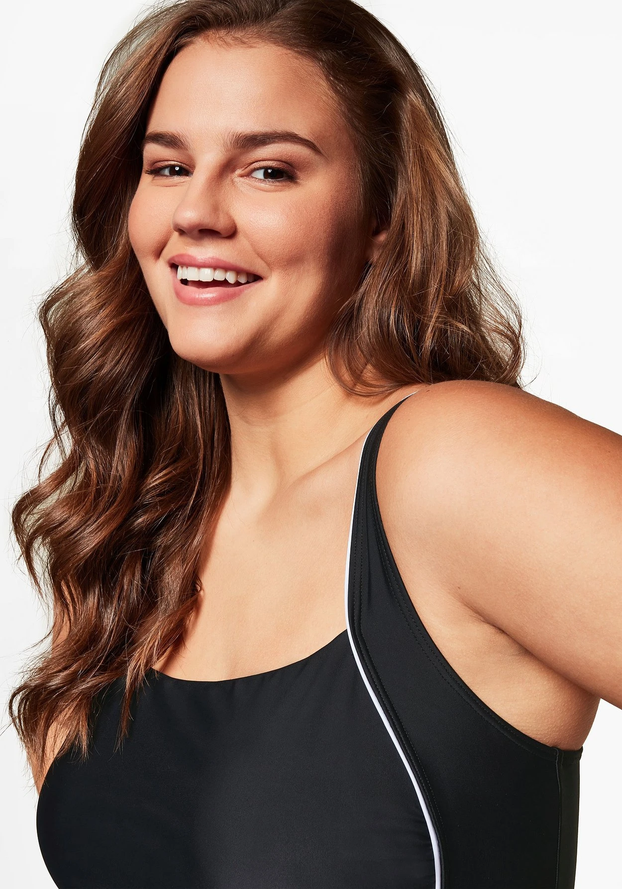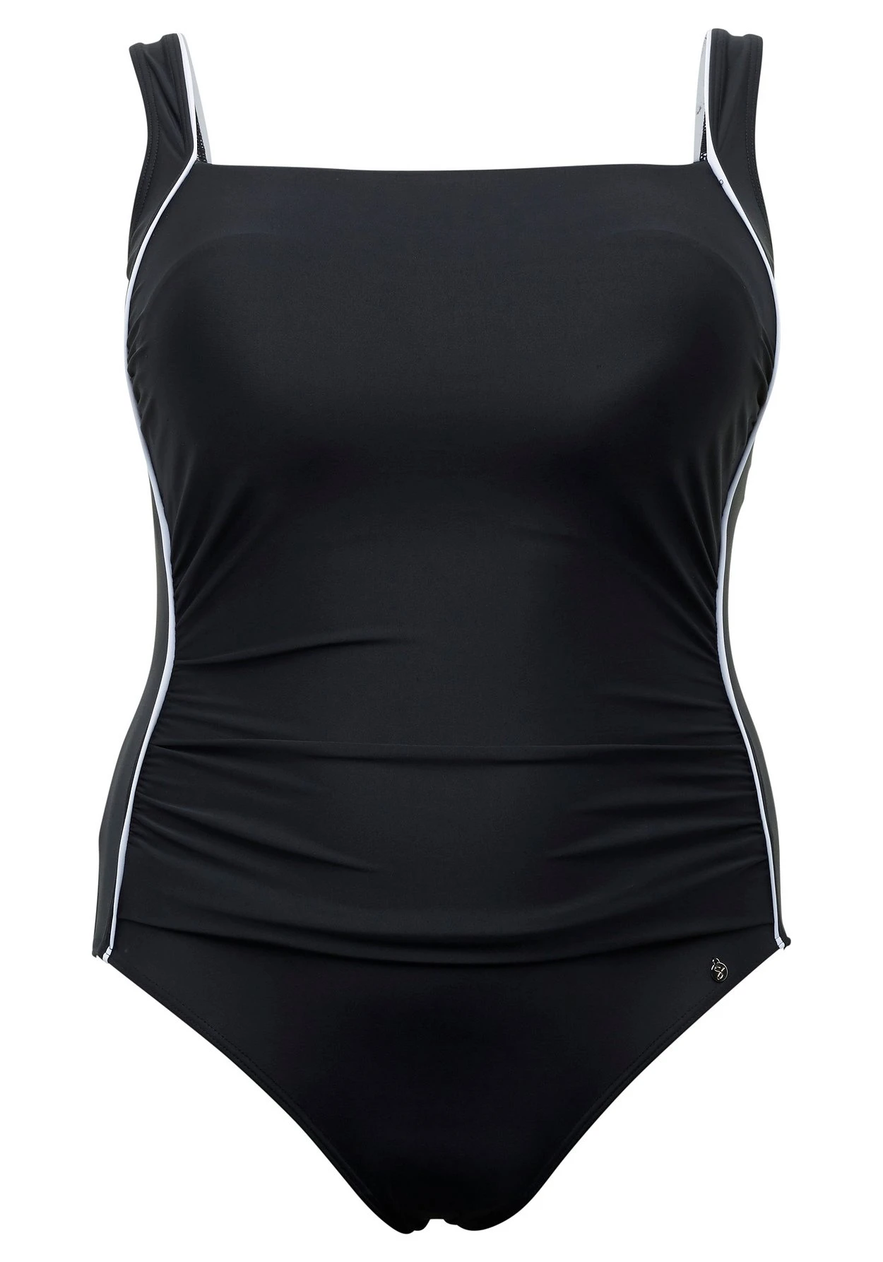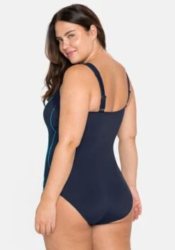 Badeanzug mit Kontrastpaspeln. Ganz klassisch besitzt er einen hohen, geraden Rückenausschnitt. Eingearbeitete Softcups und ein Unterbrustgummi formen ein schönes Dekolleté. Die verstellbaren Träger passen sich optimal der Größe an.