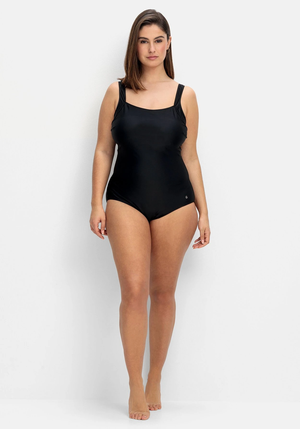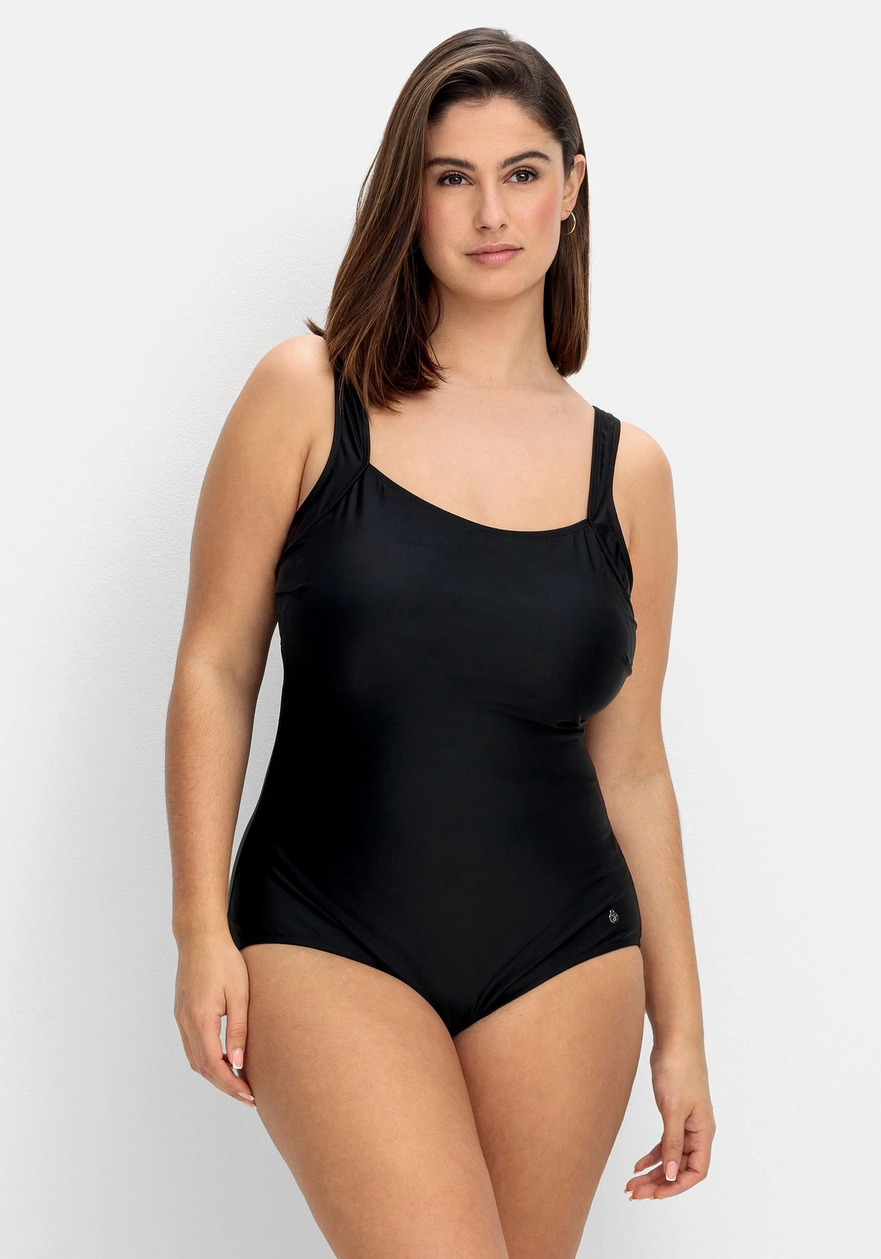 Badeanzug mit tiefem Rückenausschnitt. Die eingearbeitete Schließe dient als Eyecatcher und sorgt gleichzeitig für optimalen Halt. Ansonsten zeigt sich der Badeanzug im schlichten, puren Look. Wattierte Softcups und ein Unterbrustgummi geben der Brust Form, breite verstellbare Träger machen den Tragekomfort perfekt.