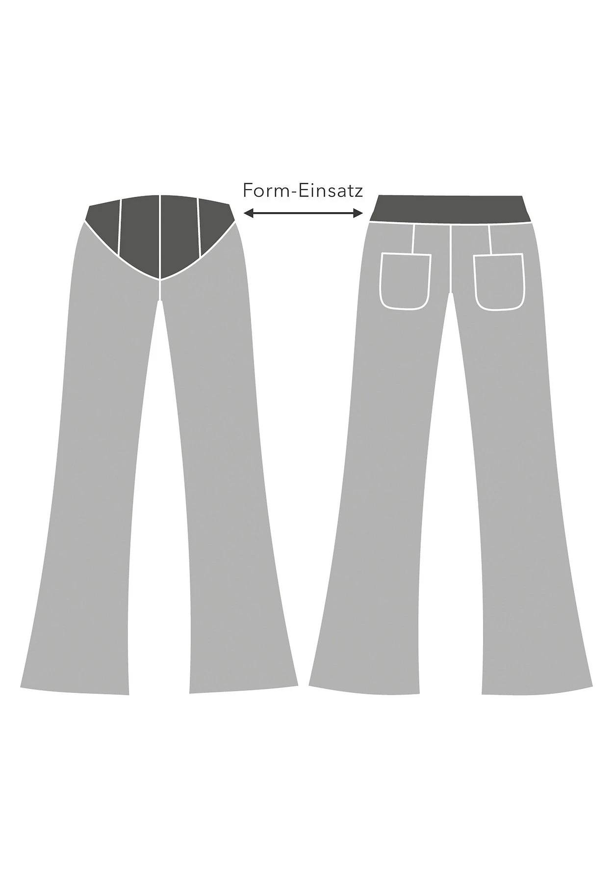 Die doppellagige Passe vorn formt die Bauchpartie, der hohe Bund unterstreicht den Effekt.
