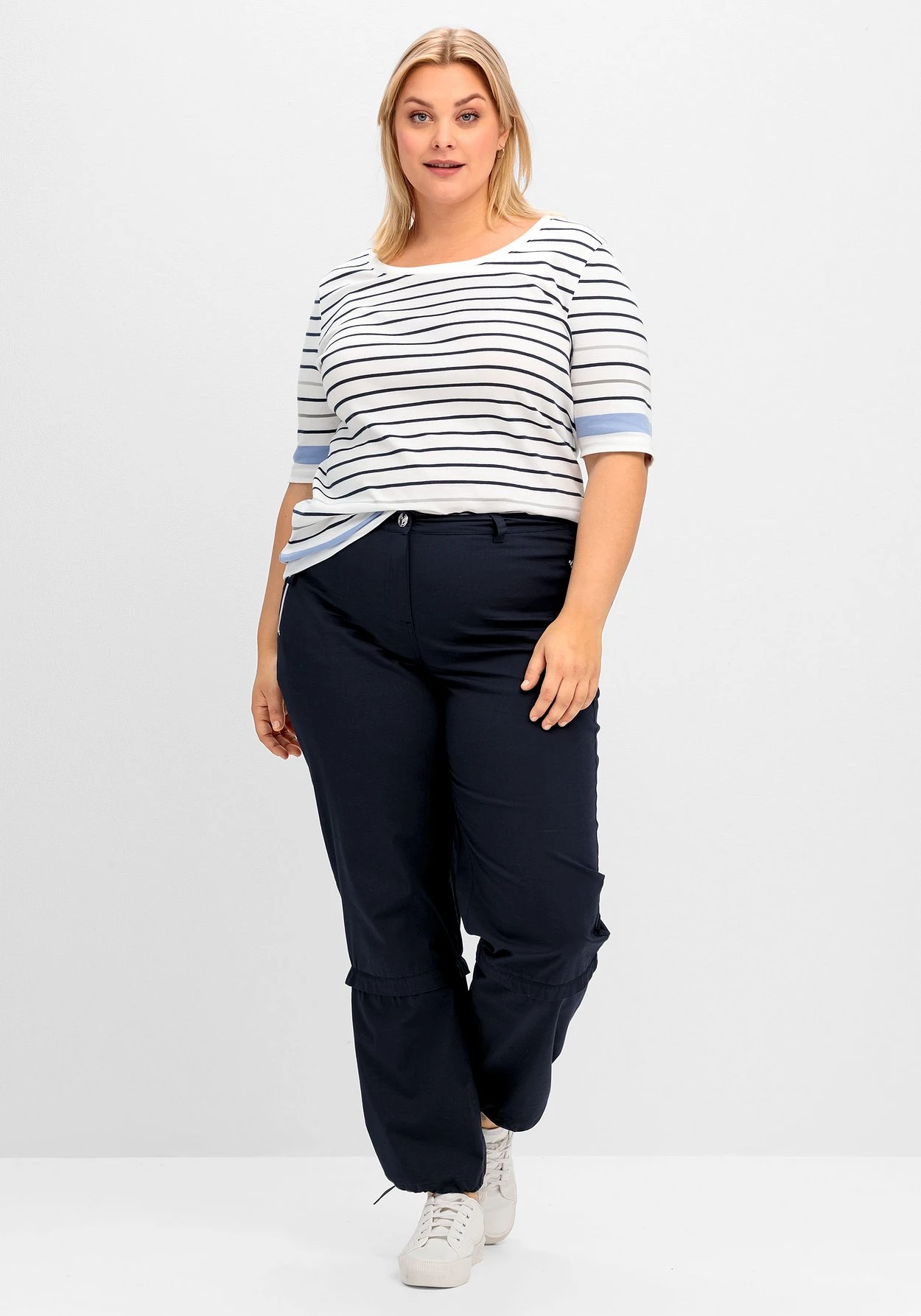 Cargohose in Popeline-Qualität. Besonders praktisch: Die Beine können entweder lang getragen oder mit Zipper auf Caprilänge gekürzt werden. Dazu kommen Reißverschlusstaschen, Formbund und Gürtelschlaufen. Ein Tunnelzug am Saum der Beine ergänzt den sportiven Look.