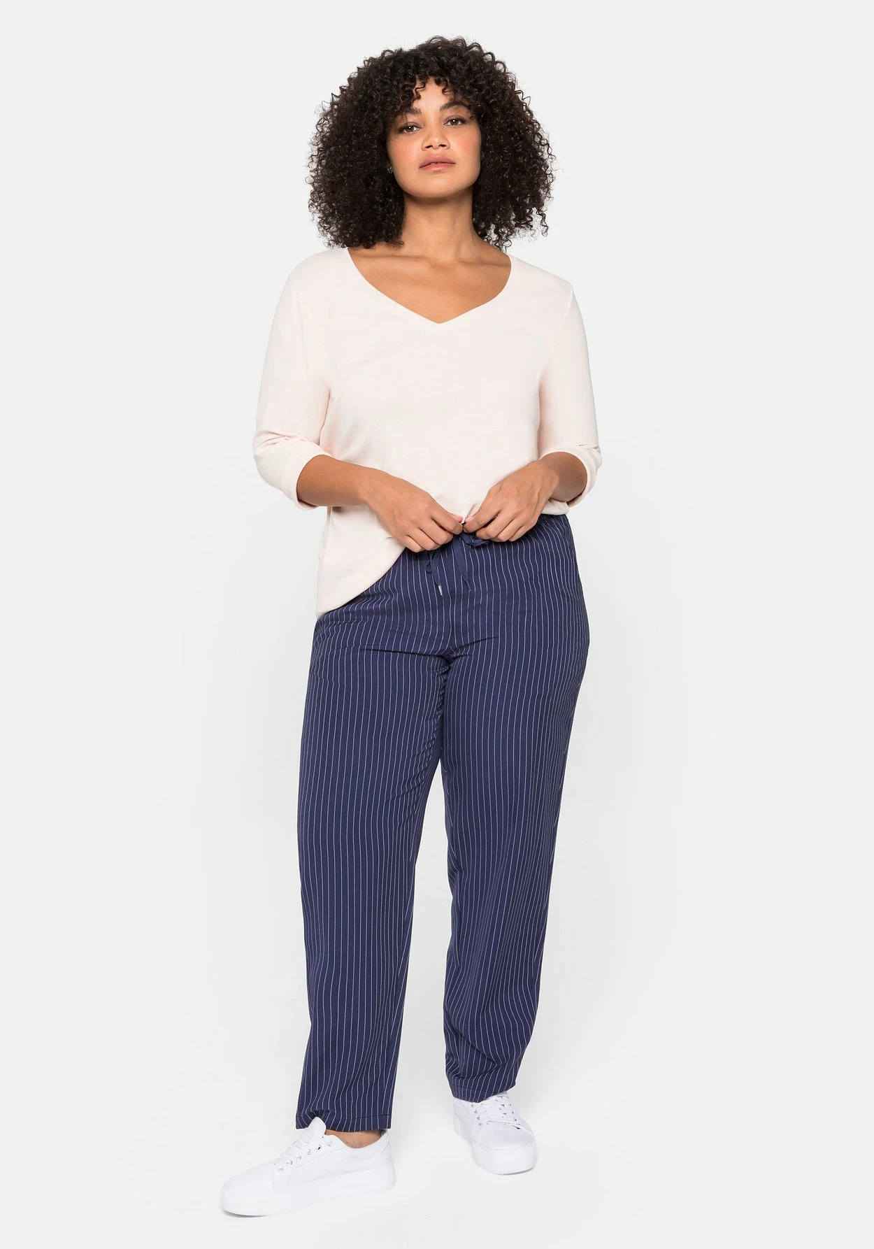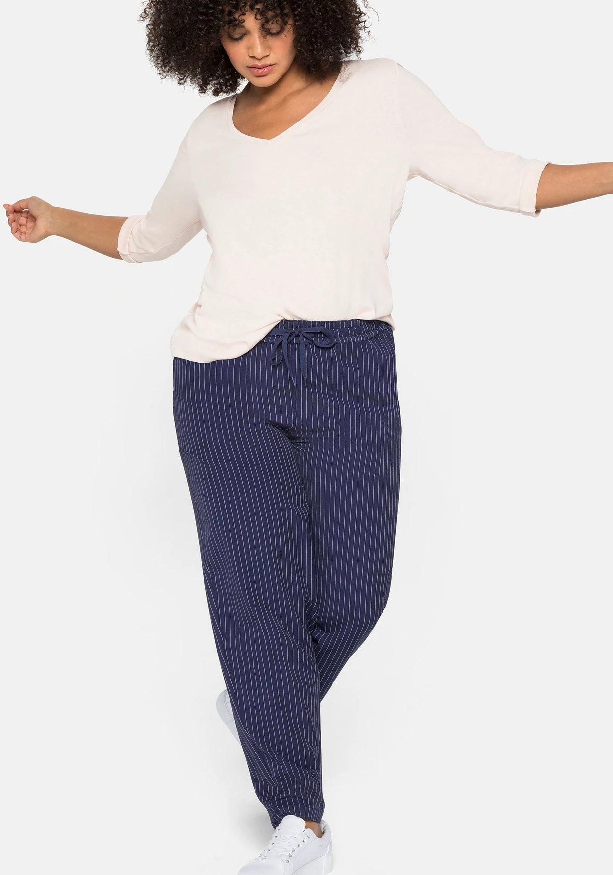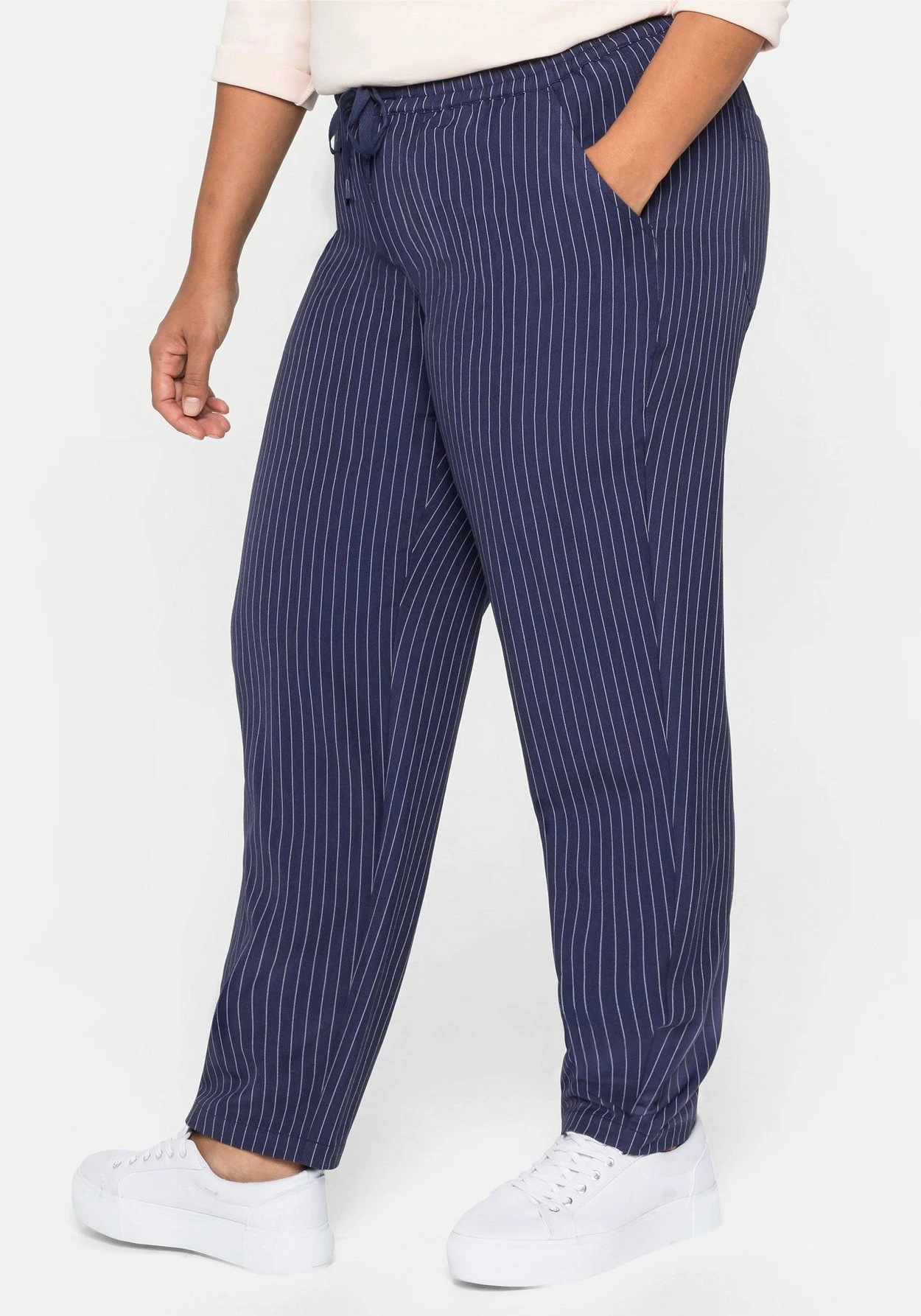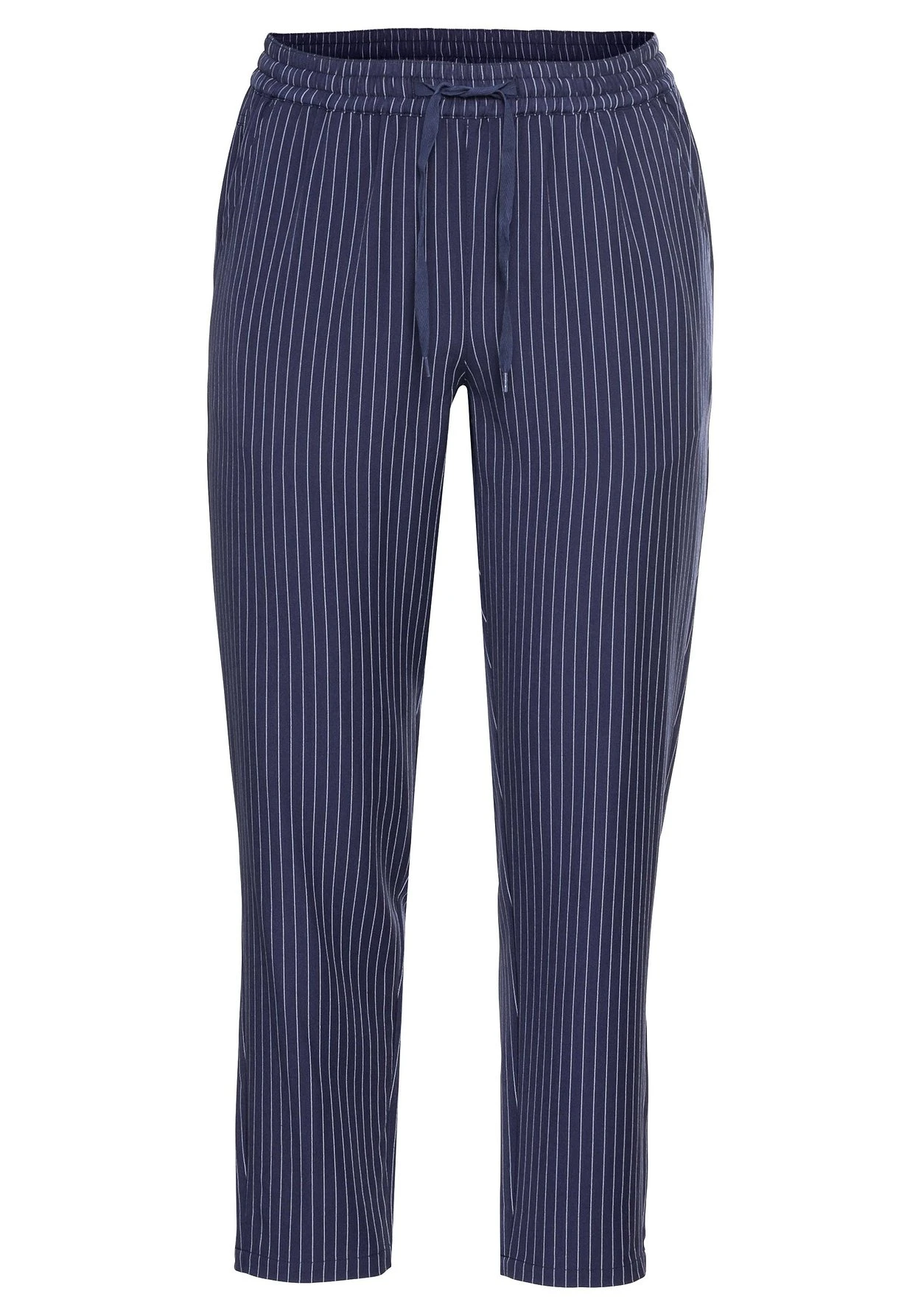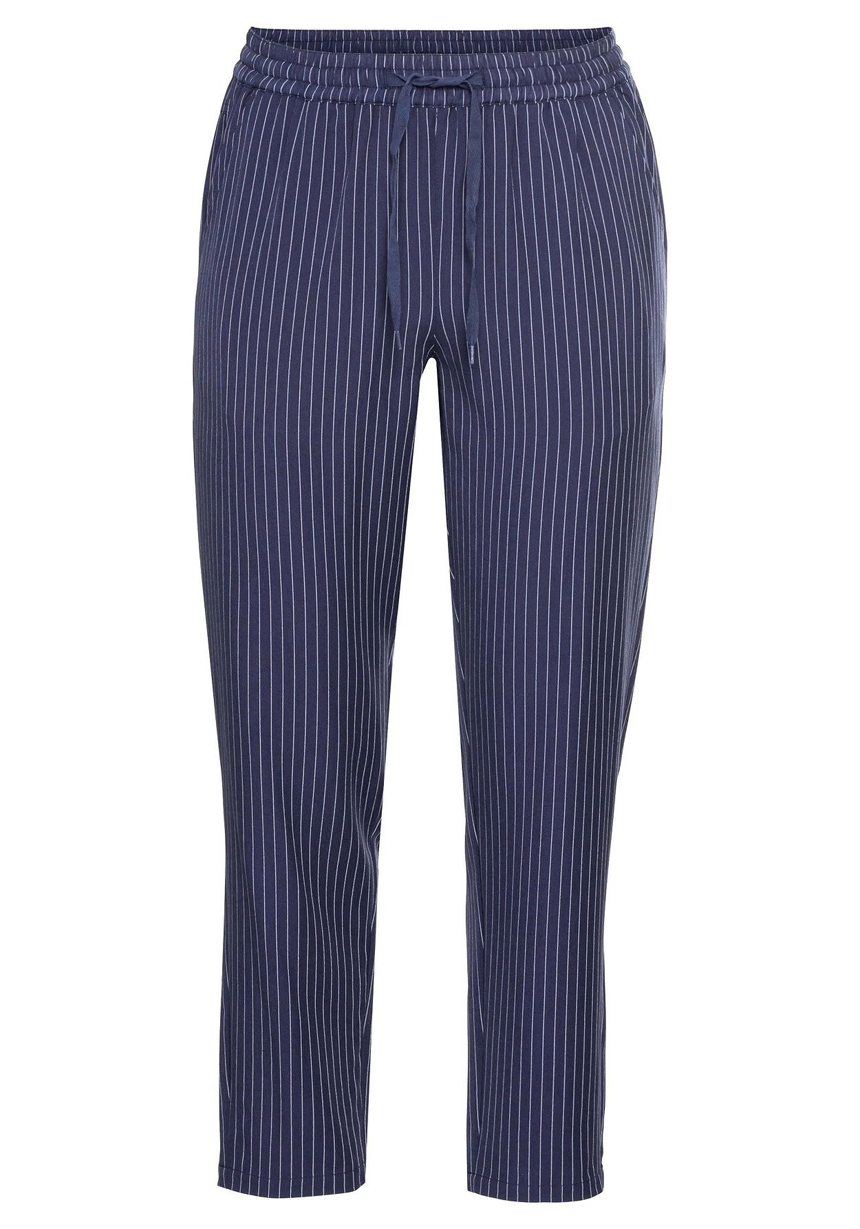 Gestreifte Joggpants. Der elastische Bund kann durch das Bindeband in der Weite reguliert werden und verleiht der Hose eine sportive Note. Die feinen Streifen wirken gepflegt, zwei Eingrifftaschen vorn und zwei aufgesetzte Taschen hinten ergänzen den Style.