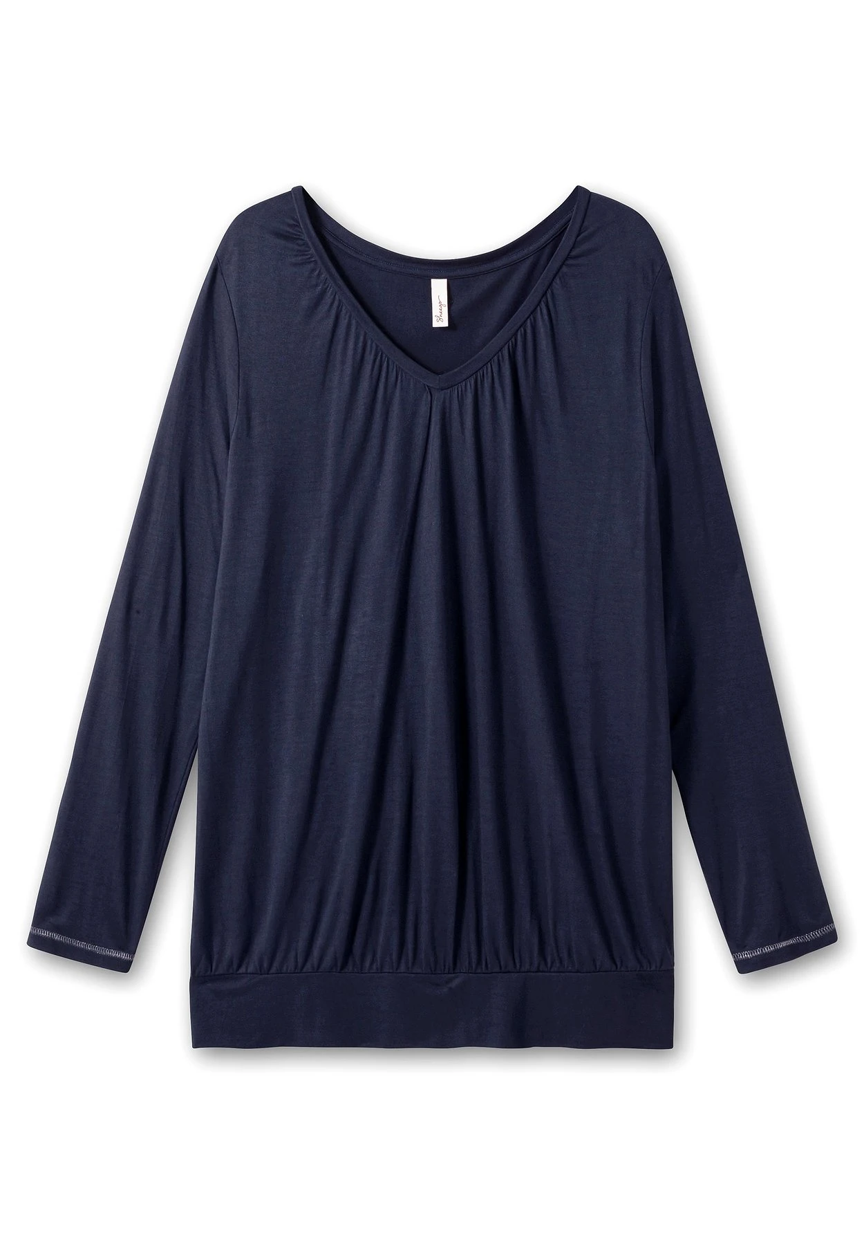 Langarmshirt mit V-Ausschnitt. Die Kräusel am Ausschnitt lassen einen raffinierten Faltenwurf entstehen, der durch den breiten Bund am Saumabschluss geschickt zusammengefasst wird.