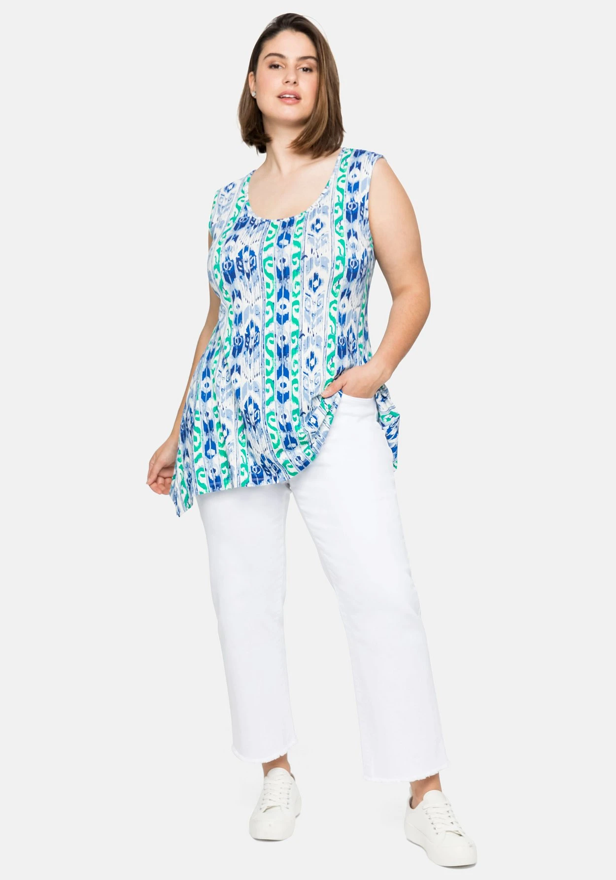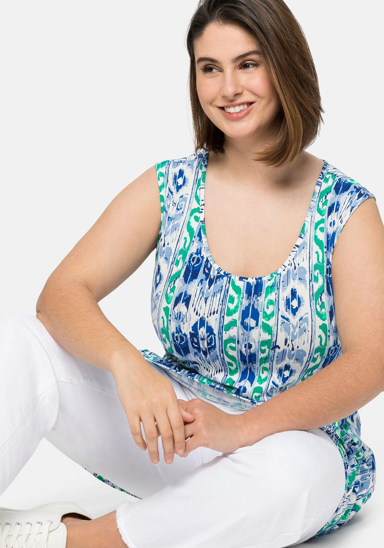 Longtop mit Alloverdruck. Seinen besonderen Look erhält es durch den gerundeten Saum mit seitlichen Zipfeln. Ein Rundhalsausschnitt ergänzt den femininen Style.