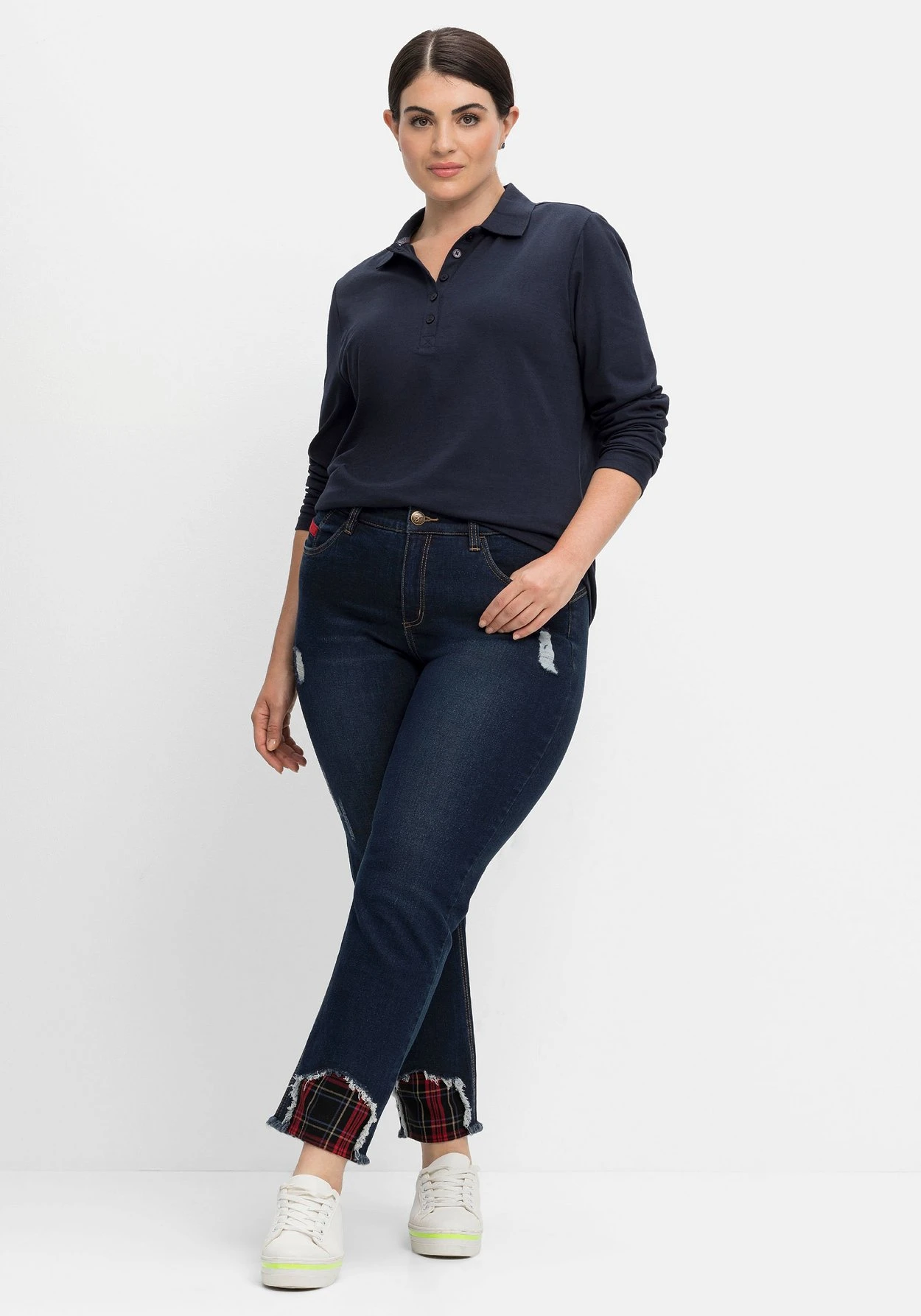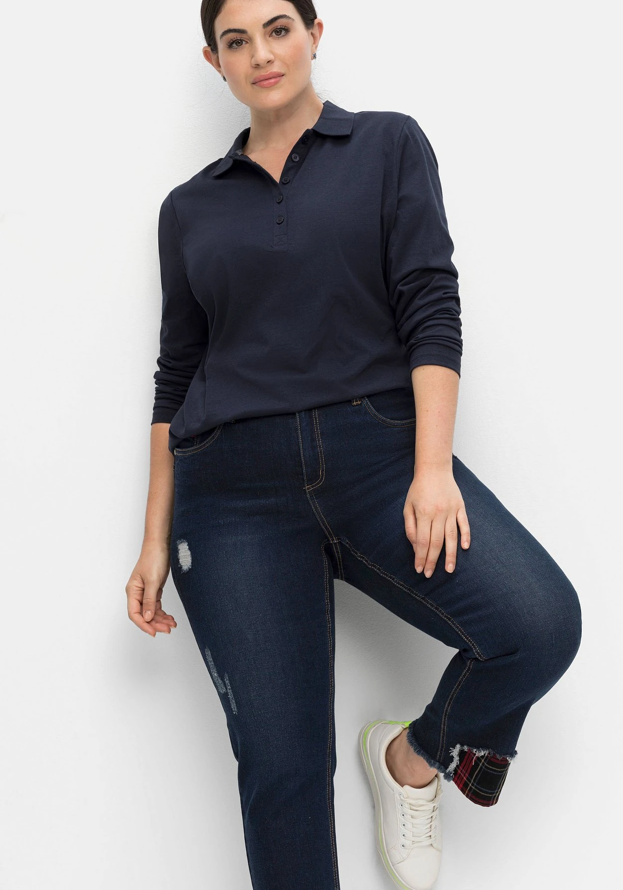 Die Qualität ist aus zertifizierter recycelter Baumwolle und zertifiziertem recyceltem Polyester gearbeitet. sheego cares!