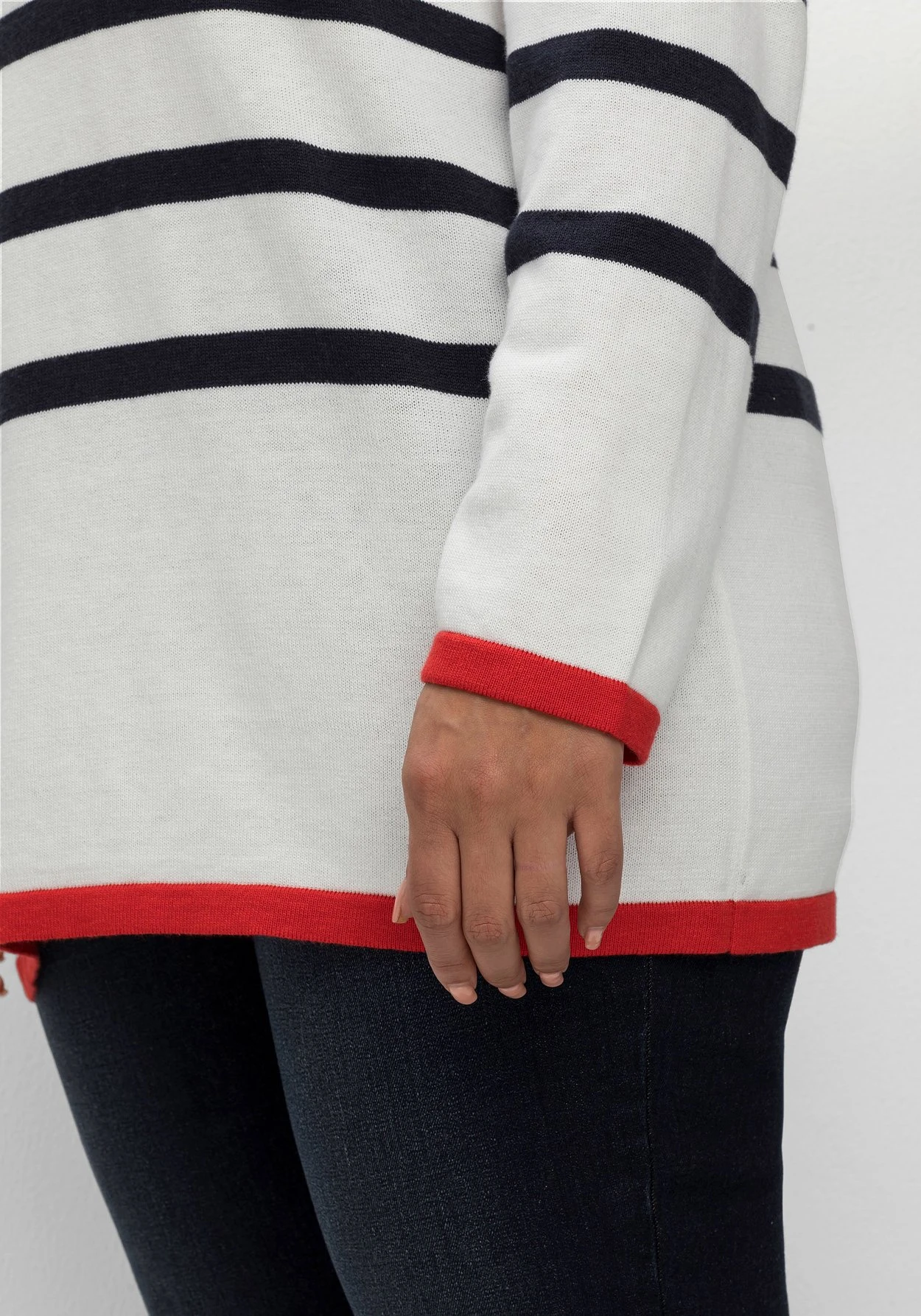 Pullover mit garngefärbten Ringeln. Der maritime Look ist mit V-Ausschnitt und farblich akzentuierter Ärmel- und Saumkante gestaltet. Hinten ziert ein dezentes Metalllabel den Nackenbereich und verrät die Herkunft des Casual-Styles.