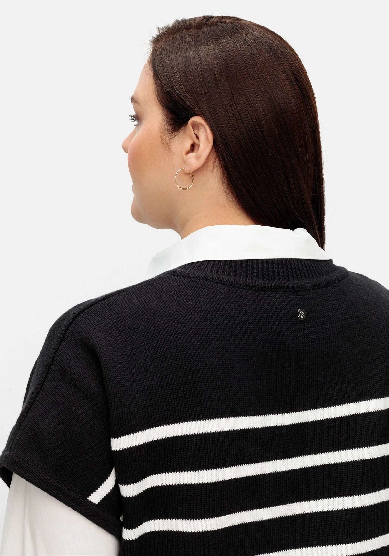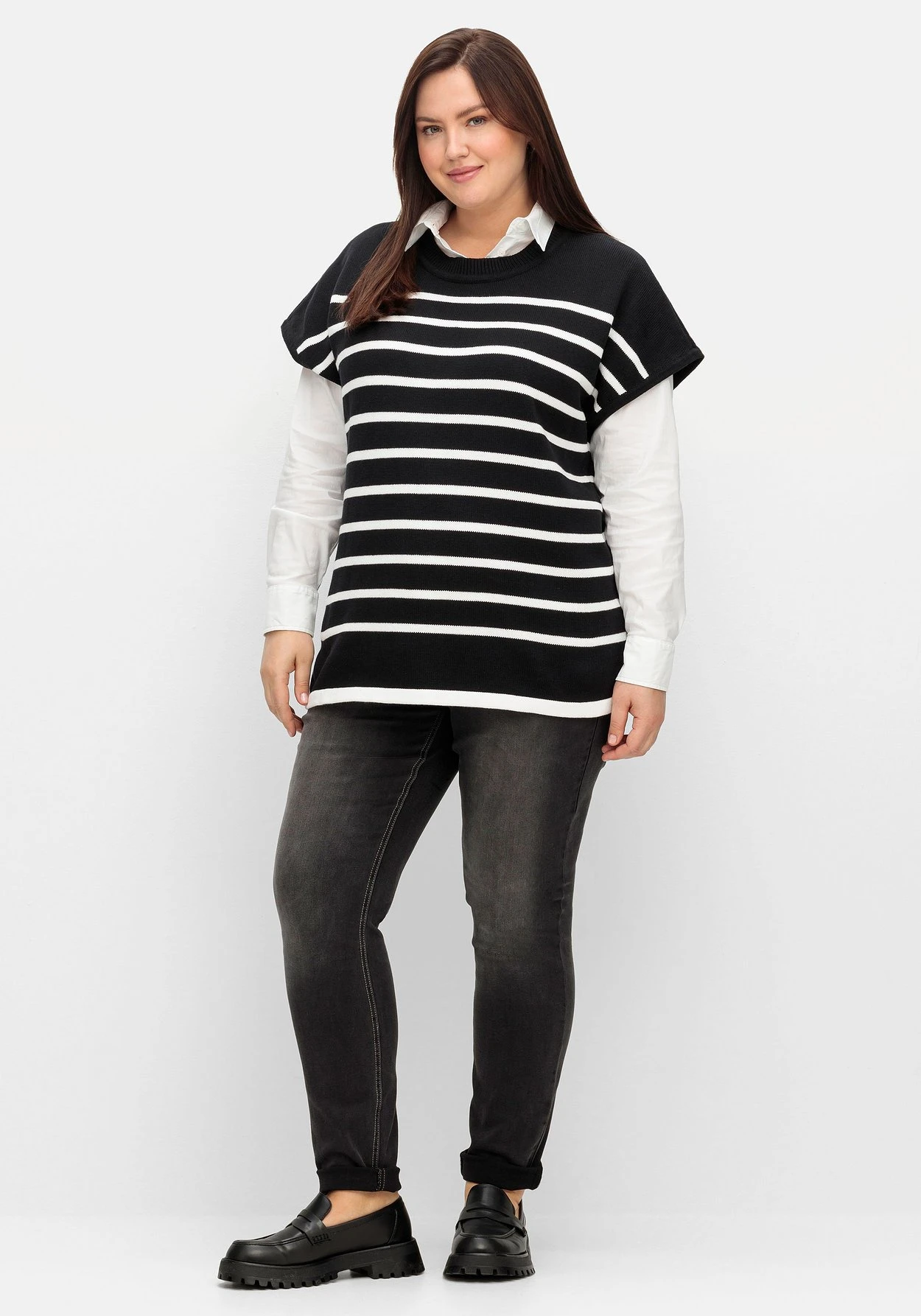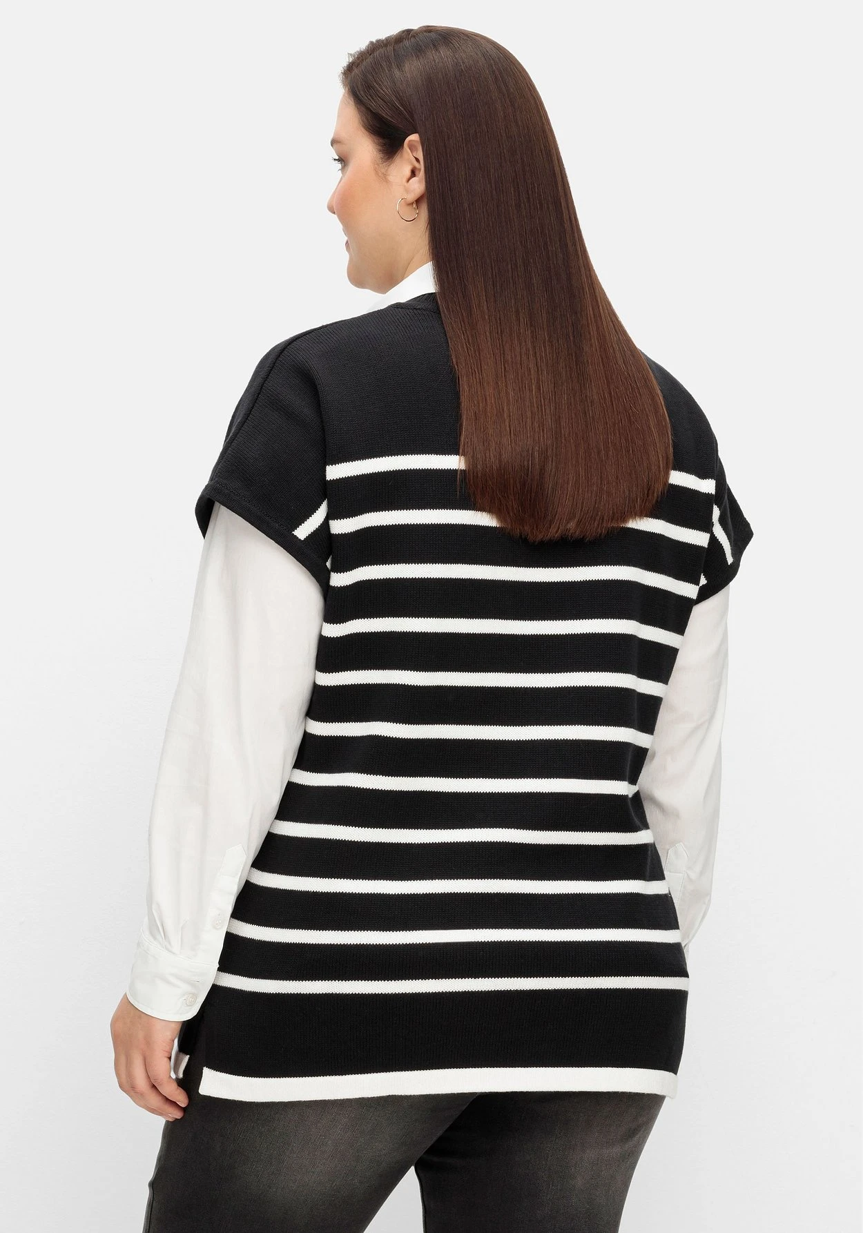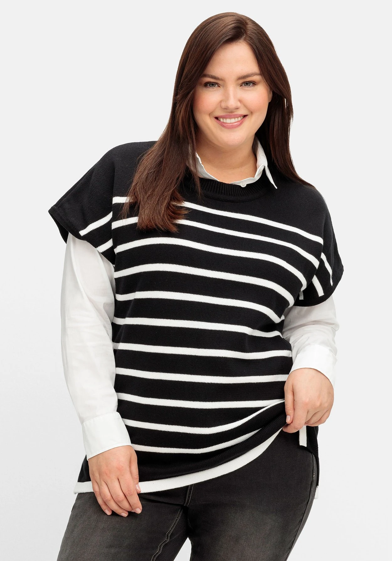Pullunder mit Streifen. Der Rundhalsausschnitt mit Rippblende, die überschnittene Schulterpartie und der gerade Saum lassen hier eine moderne Silhouette entstehen. Garngefärbte Streifen geben dem Pullunder einen zeitlos-maritimen Look, seitliche Schlitze sorgen für Bewegungsfreiheit. So entsteht ein unkomplizierter Stylingpartner, der sich zu gepflegten Blusen genauso gut kombinieren lässt wie zum legeren Langarmshirt!