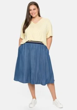 Rock in Denim-Optik. Der ausgestellte Rock in modischer Midilänge schwingt mit jedem Schritt wunderschön mit. Besonders bequem sitzt er dank des gestreiften Gummizugbundes, der gleichzeitig einen sportiven Kontrast setzt. Vorn und hinten befindet sich eine mittige Teilungsnaht, zusätzlich sind praktische Eingrifftaschen in der Seitennaht eingearbeitet. Ein toller Stylingpartner, der maritimen Sommerlooks mehr Ausdruck verleiht.