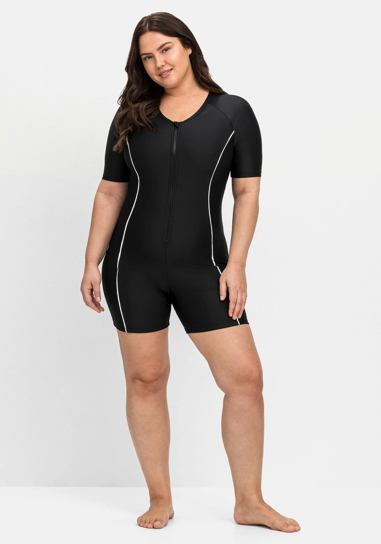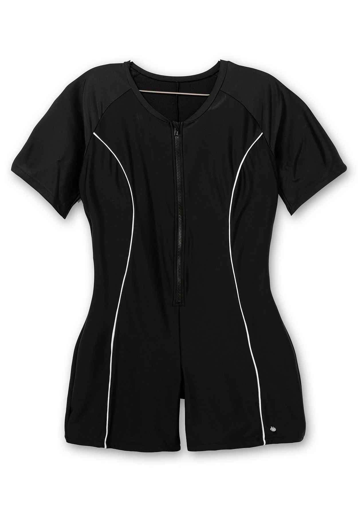 Schwimmanzug mit kurzem Ärmel und kurzem Bein. Für einen leichten Einstieg ist der sportive Badeanzug am runden Ausschnitt mit einem Reißverschluss versehen. Ab Unterbrust ist das Material vorn und hinten zusätzlich gefüttert. Ein dezentes Metalllabel schmückt den linken Beinabschluss, Kontrastpaspeln zeichnen eine schmale Linie und sind gleichzeitig ein dynamisches Finish. Das hochwertige elastische Material gibt genügend Bewegungsfreiheit und unterstützt dein aktives Schwimmtraining.