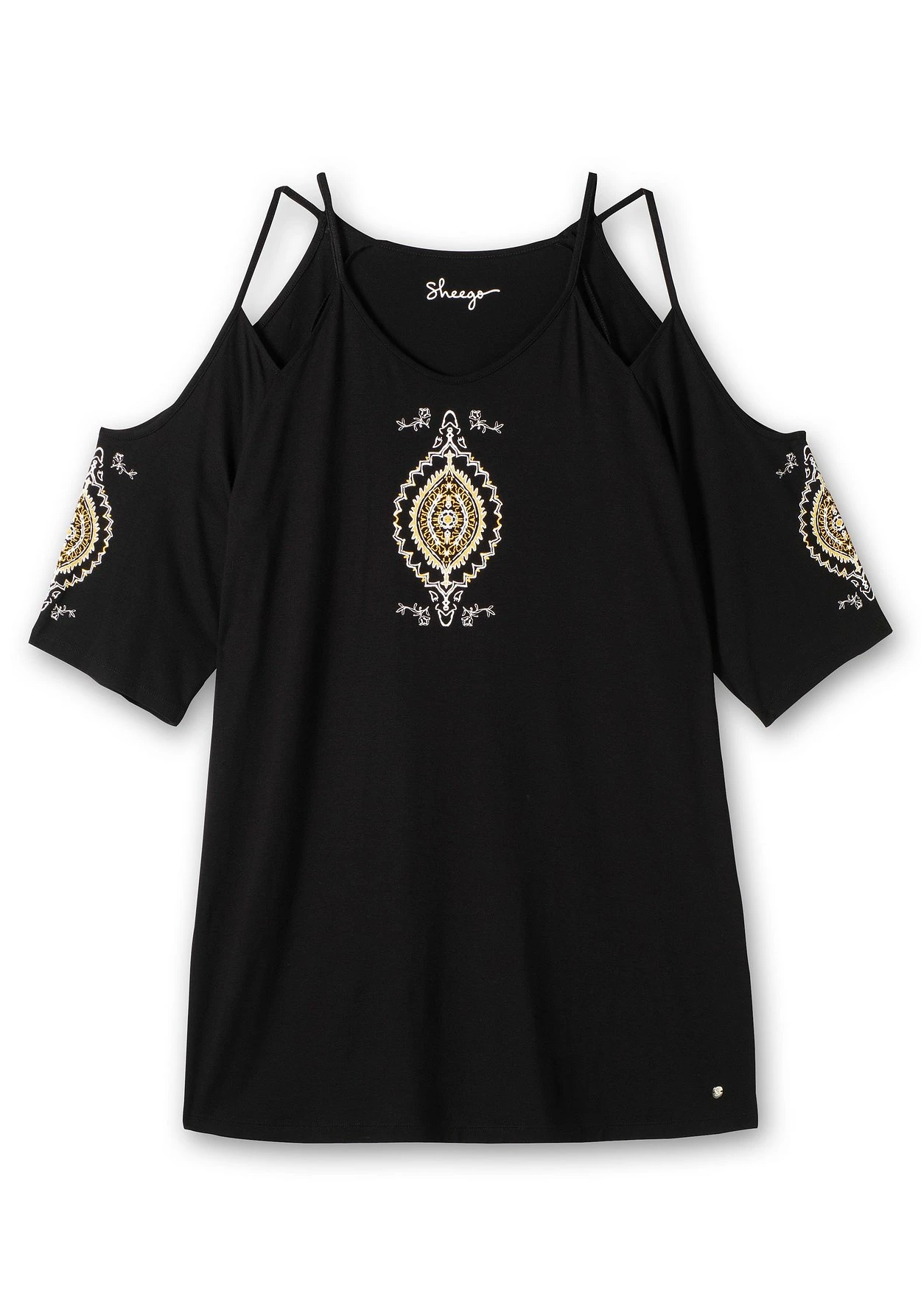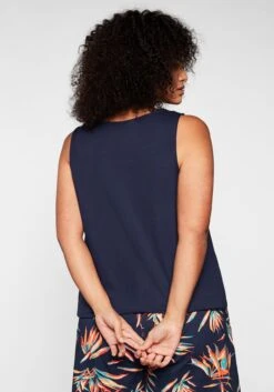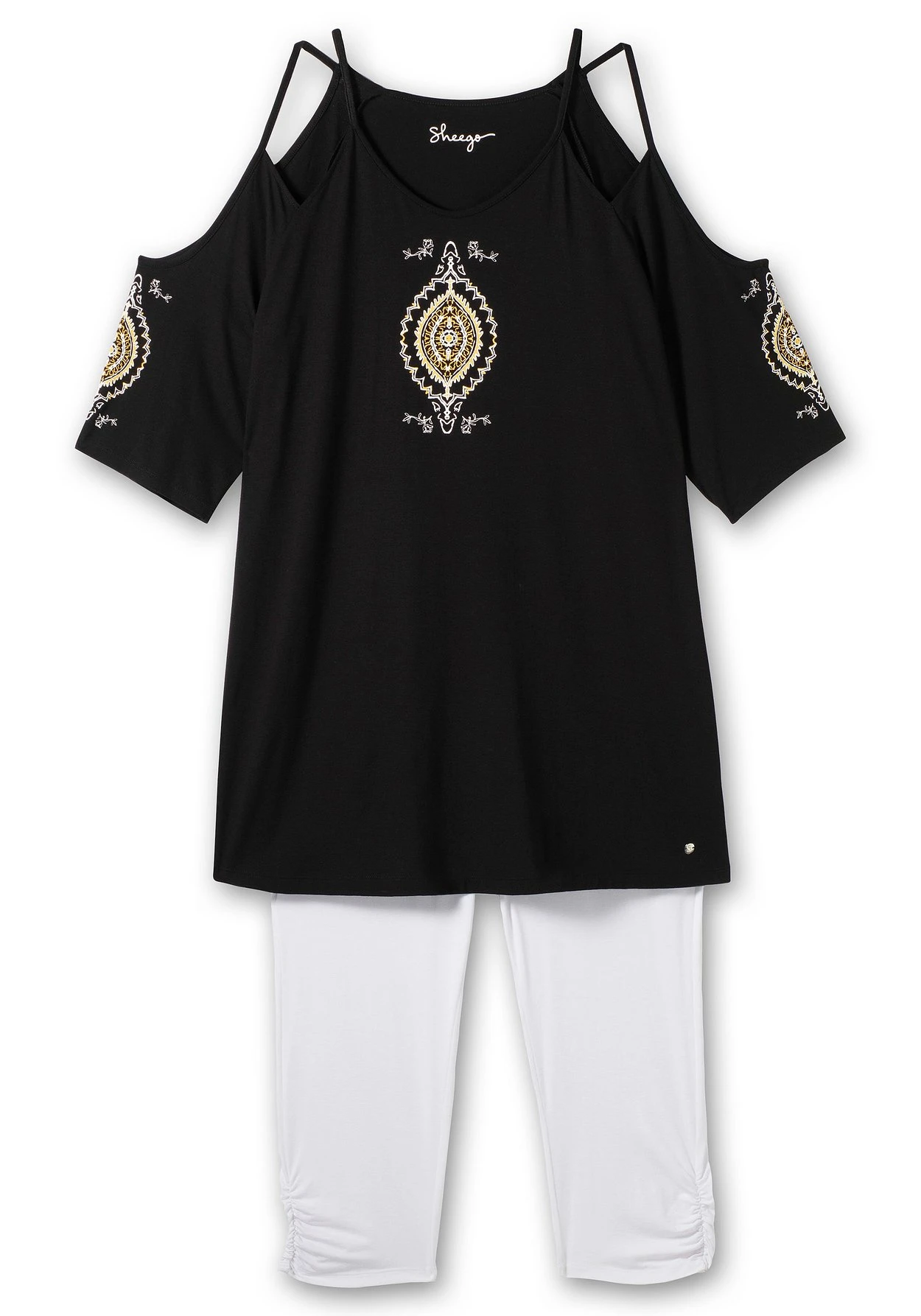 Strand-Set aus Shirt und Leggings. Das Shirt erhält seinen luftig-leichten Look durch die raffiniert gestaltete Schulterpartie: Der weite Ausschnitt wird durch schmale Träger gehalten, die Cut-outs lassen den Blick auf die Haut frei. Ein femininer Druck vorn sowie auf dem Ärmel ist dazu eine sommerliche Ergänzung. Dazu passen die Caprileggings mit seitlicher Raffung.