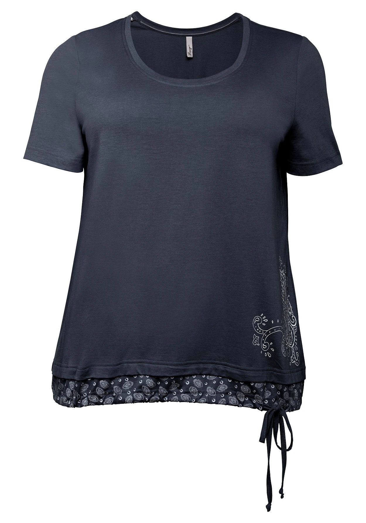 Shirt in femininer 2-in-1-Optik. Wunderschön zeigt sich der angesetzte Saumabschluss, der den raffinierten Lagenlook entstehen lässt. Das hübsche Muster und der Tunnelzug mit Bindeband ergänzen den Effekt. Hingucker ist der platzierte Druck mit schwungvollen Formen seitlich über dem Saum. Dazu ist das Oberteil mit einem etwas weiteren Rundhalsausschnitt gestaltet.