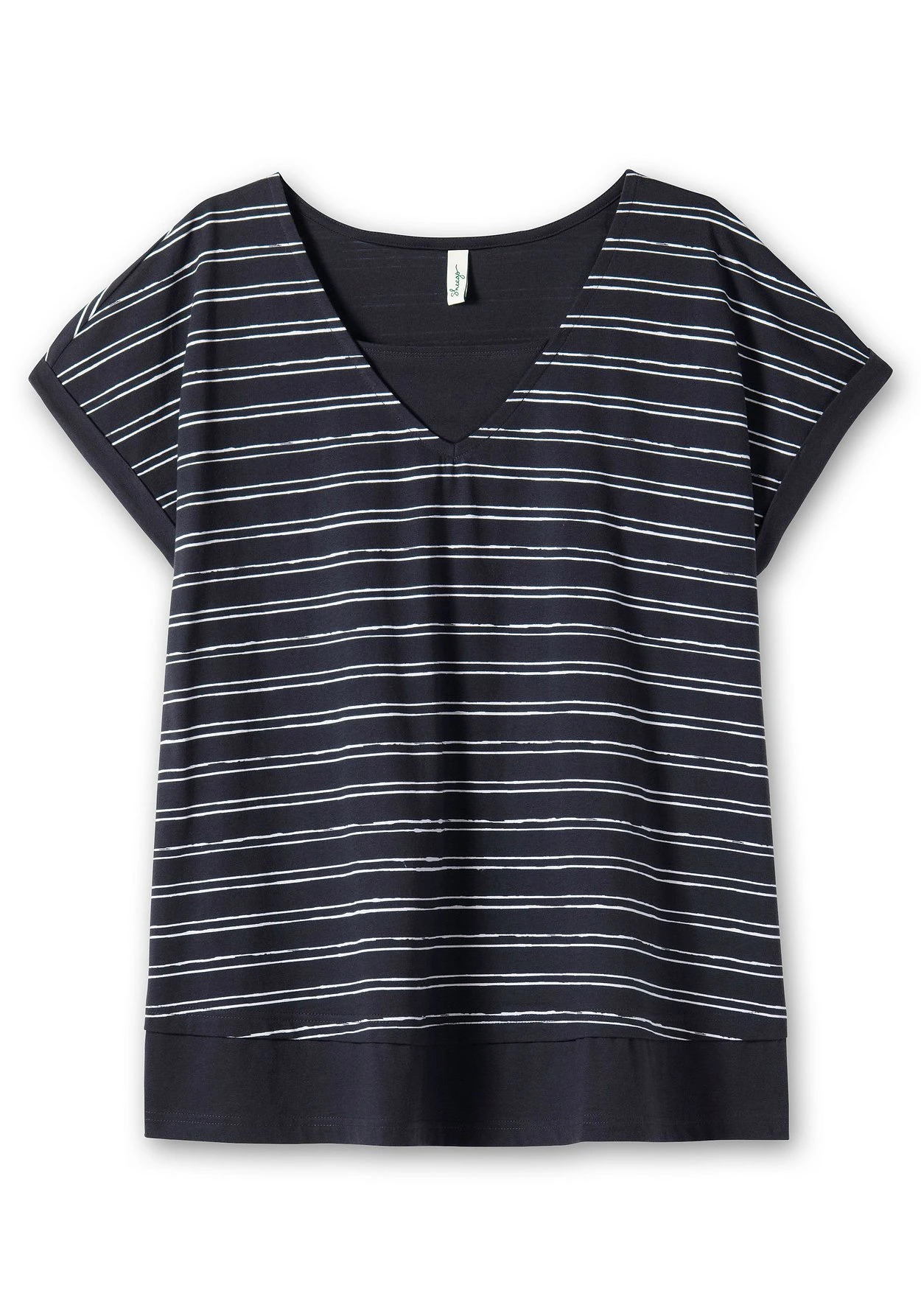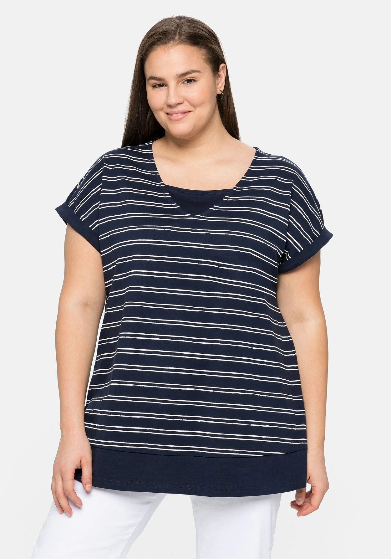 Shirt in 2-in-1-Optik. Der modische Lagenlook entsteht durch den unifarbenen Einsatz am V-Ausschnitt sowie am Saumabschluss. Dezente Streifen in leicht gebrochener Optik lockern den schlichten Style zusätzlich auf. Für das sportive Finish sorgen die überschnittenen Ärmel mit fixiertem Aufschlag.