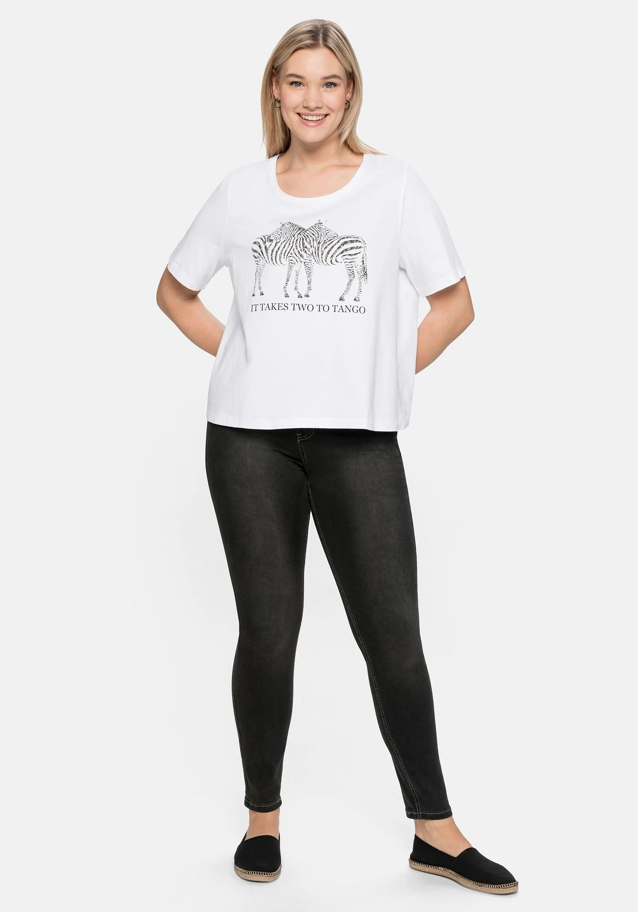 Shirt in leichter, figurschmeichelnder A-Linie. Der schlichte Style erhält sein modisches Update durch den charmanten Zebra-Frontdruck mit lustigem Wordingprint. Für bequemen Tragekomfort sorgt der legere Schnitt, etwas längere Ärmel schmeicheln den Oberarmen.