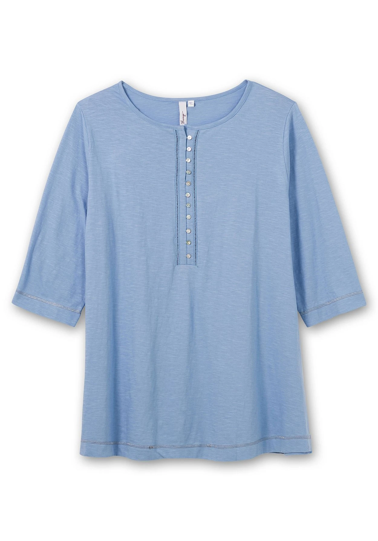 Shirt mit Rundhalsausschnitt. Leicht schimmernde Knöpfe in Perlmutt-Optik und dezente, feine Spitzeneinsätze schmücken dekorativ die Knopfleiste. Die Ärmel enden in lässiger 3/4-Länge, seitliche Schlitze geben mehr Bequemlichkeit rund um die Hüfte.