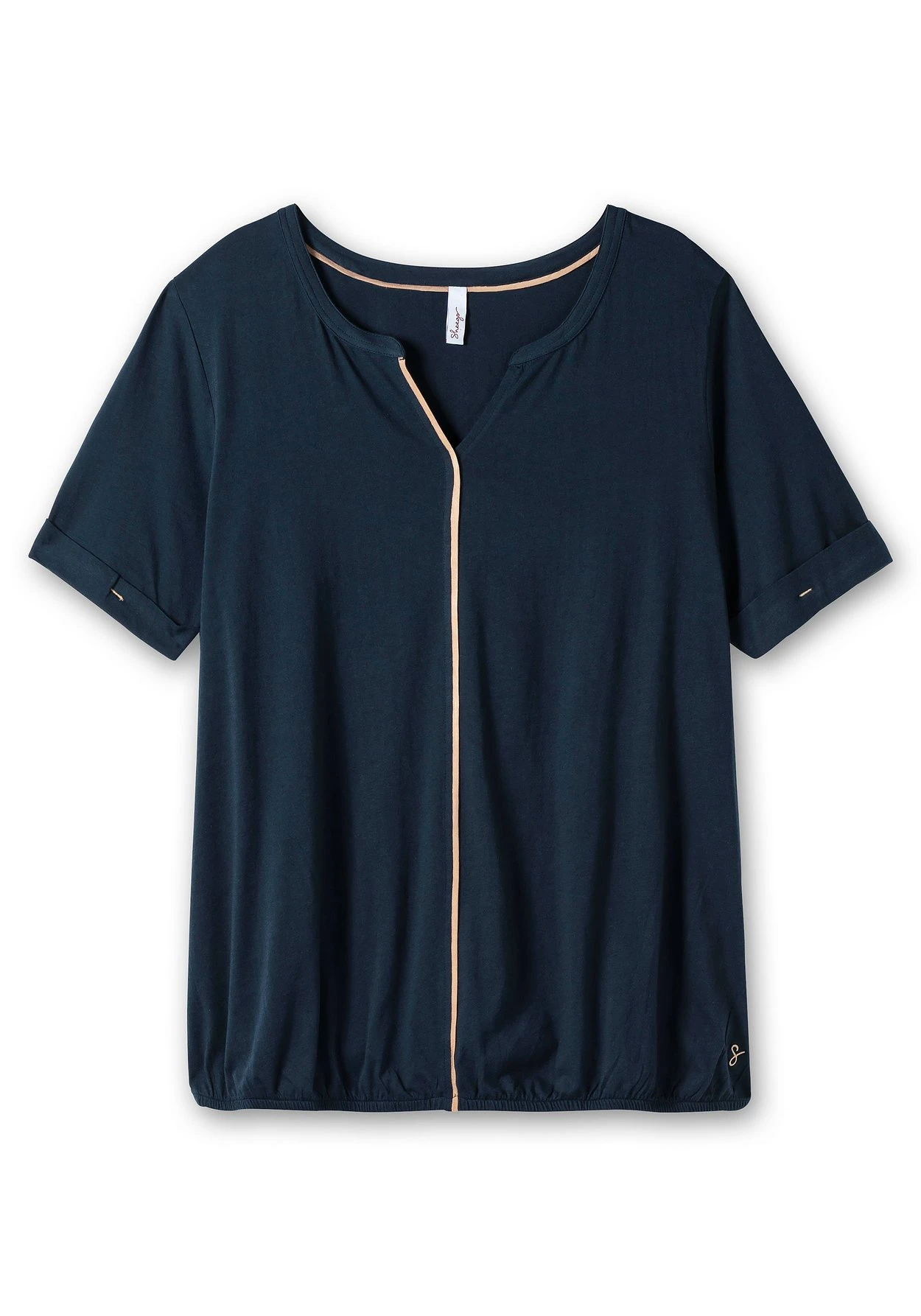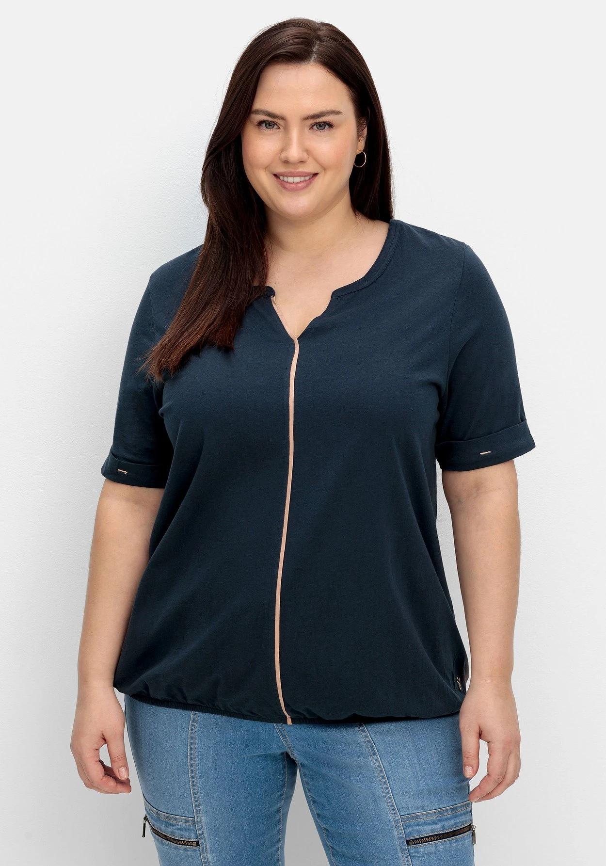 Shirt mit verlängertem Halbarm. Der Rundhalsausschnitt ist mit einem Schlitz gearbeitet, darunter schließt sich die markante Teilungsnaht mit kontrastfarbener Paspel an. Sie gibt dem Oberteil eine sportive Note und wirkt gleichzeitig optisch streckend. Ein Gummibund am Saum fasst den lockeren Fit an der Hüfte zusammen und sorgt so für angenehme Weite rund um die Bauchpartie.