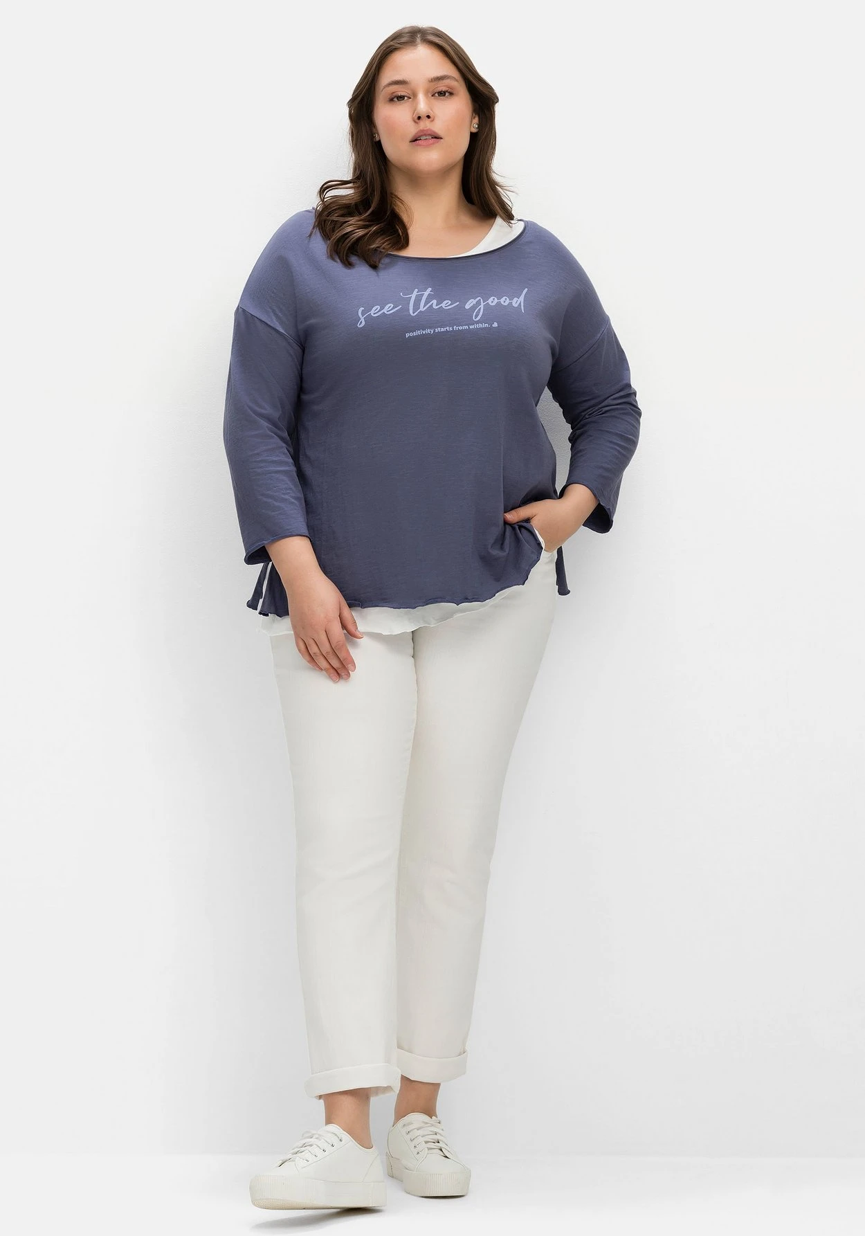 Shirt mit Top im angesagten Layerlook. Durch die überschnittenen 3/4-Ärmel, die offenen Kanten sowie den modischen Wordingprint erhält das Shirt seine coole, lässige Optik. Durch den weiten Rundhals und die kürzere Form des Oberteils blitzt das Top heraus, seitliche Schlitze lassen das obere Teil locker über das Top fallen.