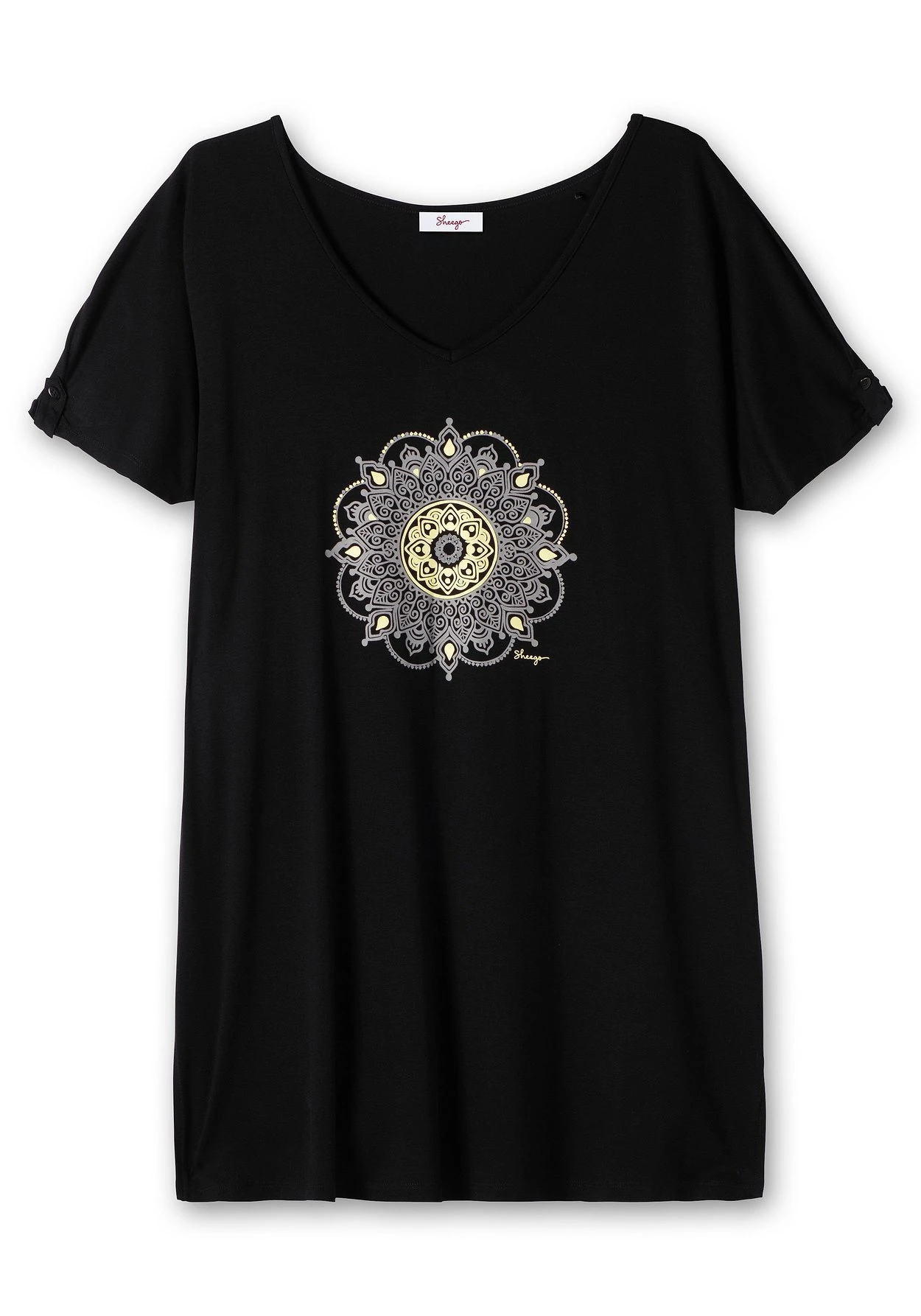 Strand-Longshirt in bequemer Oversized-Form. Hingucker ist der große, dekorative Ornament-Frontdruck. Das Shirt ist mit einem tiefen V-Ausschnitt gearbeitet, die Ärmel enden mit fixierten Riegeln. Abgerundet wird der Look durch hohe Seitenschlitze.