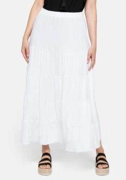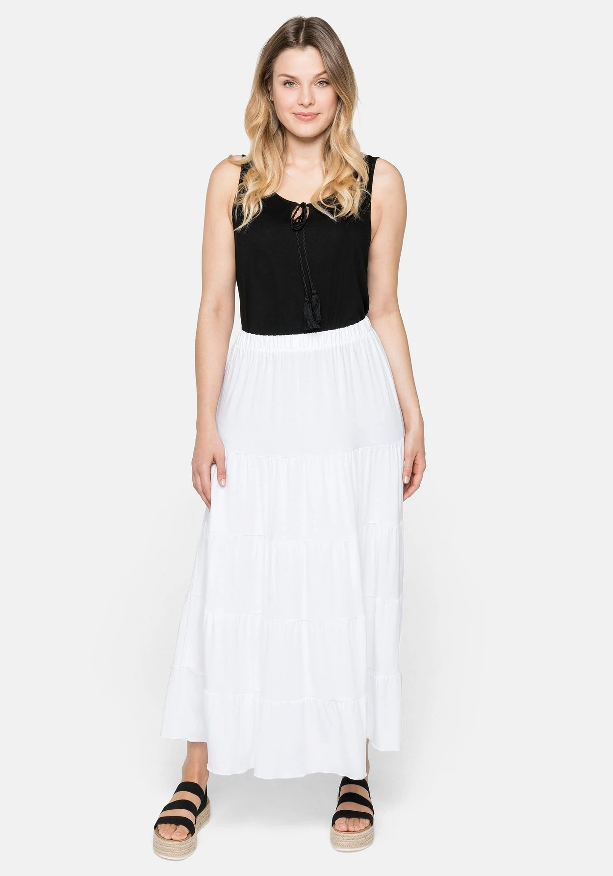 Strandrock in Maxilänge mit femininen, mehrstufigen Volants. Der bequeme Gummibund und der nach unten hin weiter werdende Schnitt sprechen für maximale Bequemlichkeit. Ein idealer Begleiter für Strandspaziergänge an heißen Sommertagen!