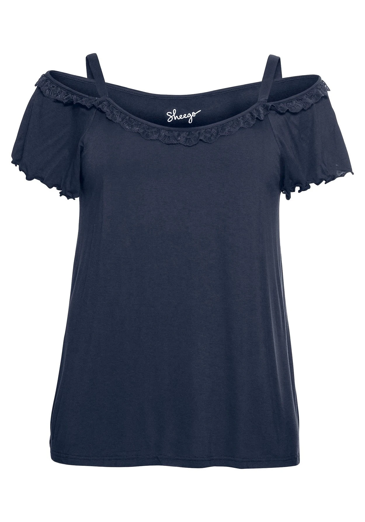 Strandshirt im modischen Off-Shoulder-Look. Dieses Oberteil besticht mit femininen Details: So ist der Carmenausschnitt rundum mit zarter Spitze umsäumt, schmale Träger und der Babylocksaum am Flügelärmel runden den Style verspielt ab.