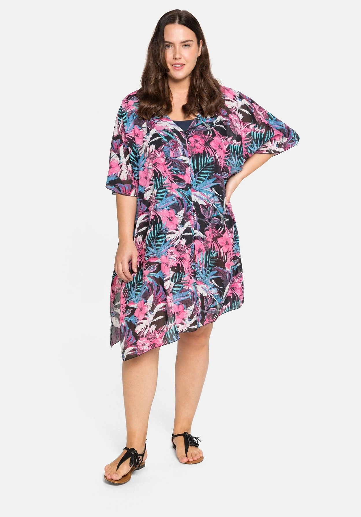 Strandtunika in leichter, transparenter Webqualität. Der luftige Schnitt zeigt sich mit Fledermausärmeln und V-Ausschnitt, für Urlaubsfeeling sorgt der tropische Print. Hohe seitliche Schlitze und eine Knopfleiste runden den Style modisch ab.