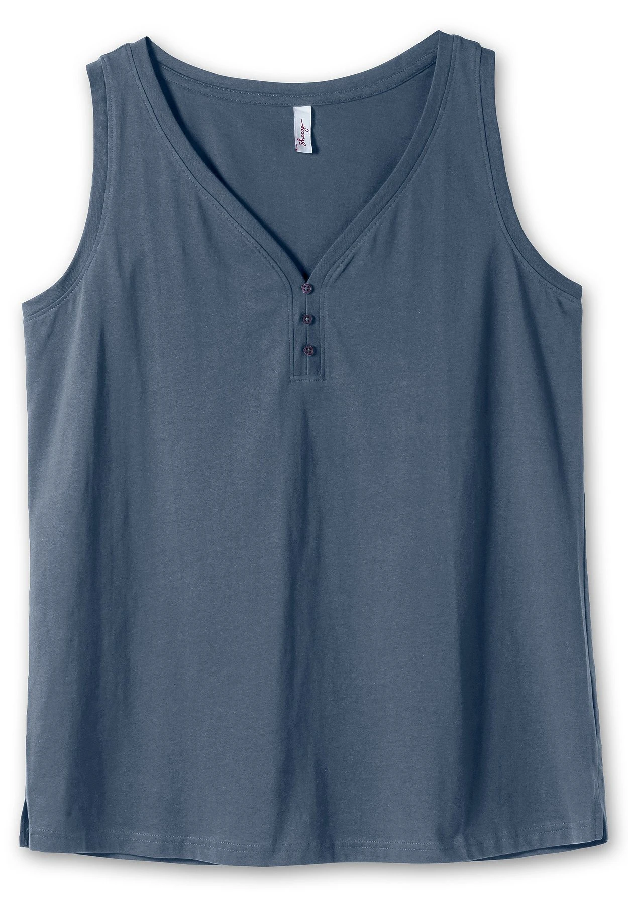 Jerseytop mit breiten Trägern. Das sommerliche Oberteil zeigt sich mit tieferem V-Ausschnitt und dekorativer Zierknopfleiste. Kurze seitliche Schlitze lassen das Top locker über die Hüfte fallen.