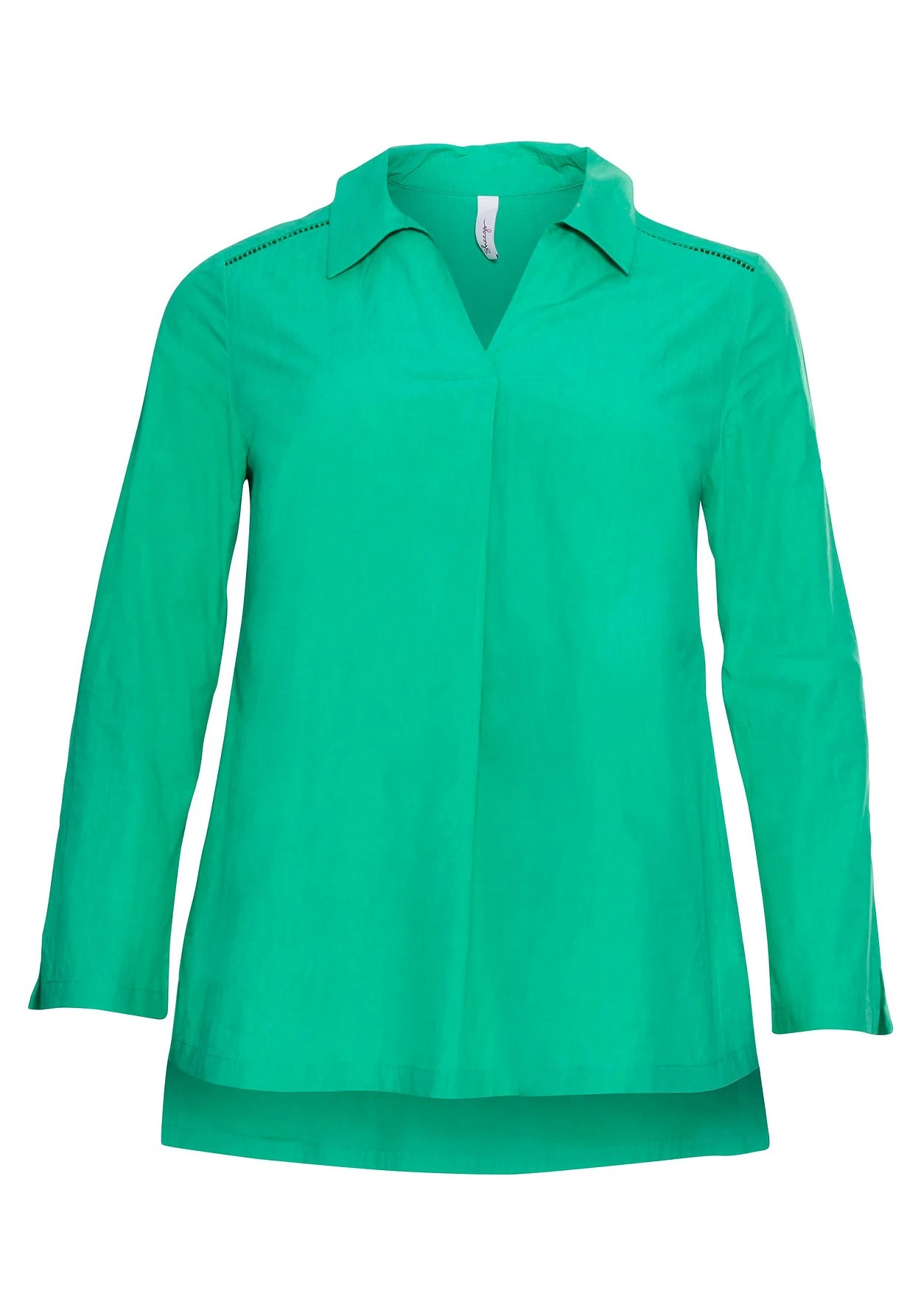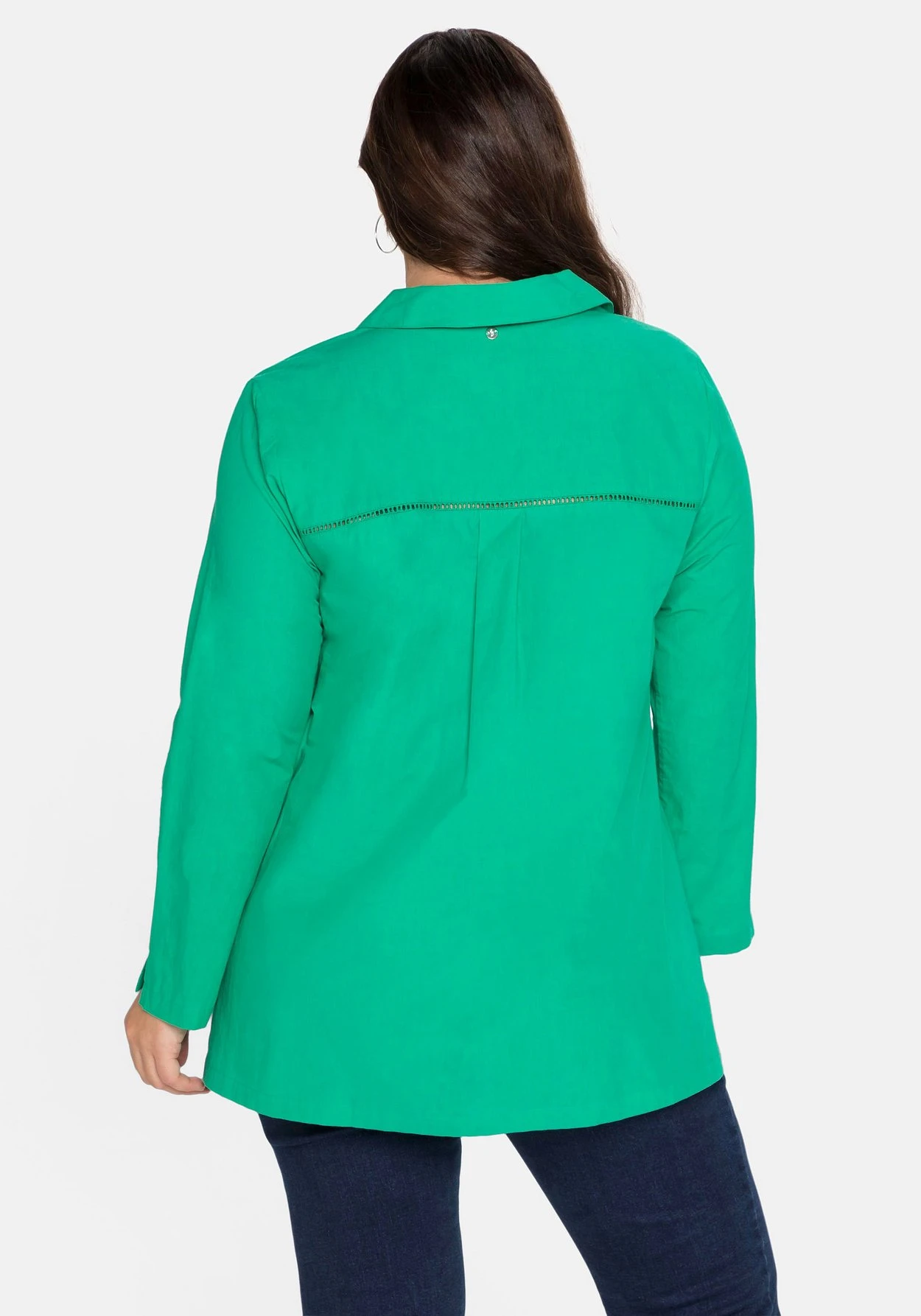Tunika aus Popeline. Für den klassischen Look sorgt der Blusenkragen, der in einen V-Ausschnitt übergeht. Die darunterliegende Falte sorgt für Raffinesse und einen schönen Fall. Verspieltes Detail ist das Lochmuster an der vorverlegten Schulternaht, die leicht ausgestellten und geschlitzten Ärmel sind dazu eine stilvolle Ergänzung. Der Rücken wird durch eine Passe mit Quetschfalte und Lochmuster dekoriert.