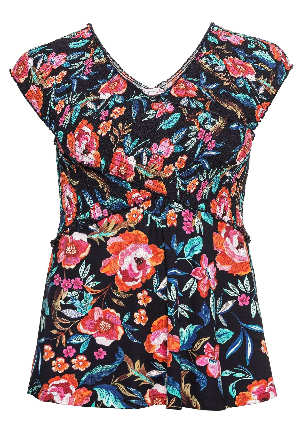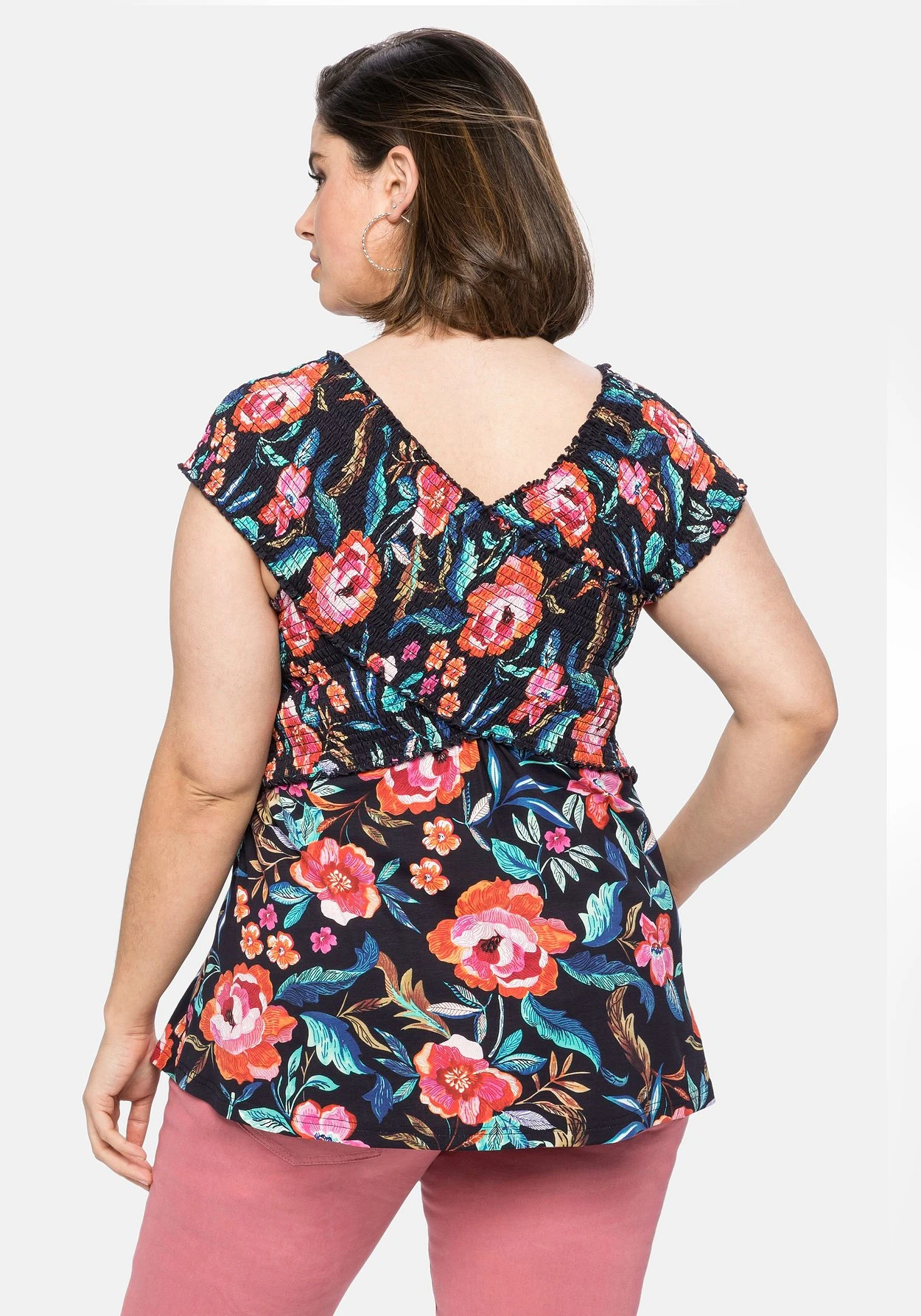 Shirt mit Blumendruck von sheego by Joe Browns. Die gesmokte Wickeloptik sorgt hier für feminine Raffinesse. Das Oberteil ist mit einem V-Ausschnitt vorn und hinten gearbeitet, der sich auch schulterfrei in der Carmen-Variante tragen lässt. An den überschnittenen Schultern befinden sich kurze Ärmel mit Wellensaumkanten.