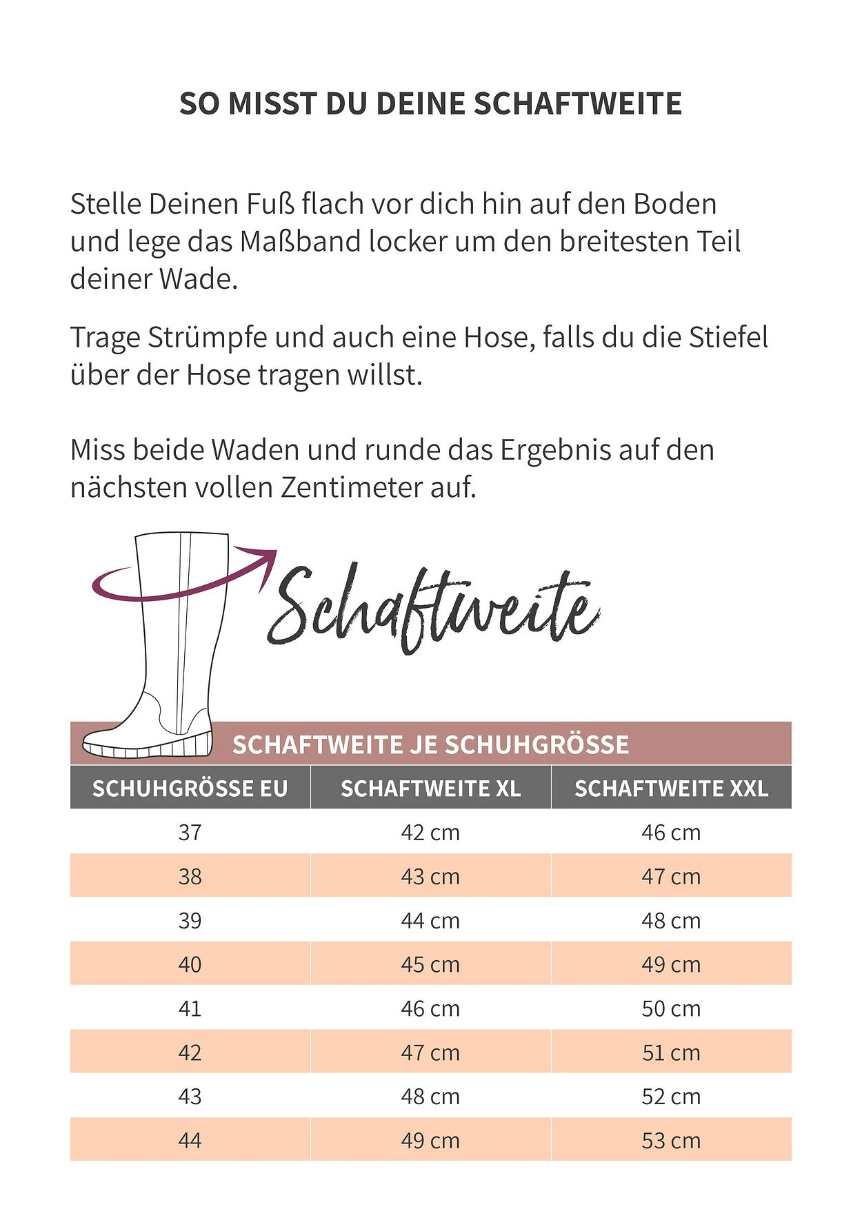 Bei der Fußweite F handelt es sich um eine Standardweite für normale Füße. Die Schaftweite XL beträgt ca. 42-49 cm, die Schaftweite XXL ca. 46-53 cm und die Schafthöhe ca. 40 cm. Die Schaftweite XL beträgt ca. 40-47 cm und die Schaftweite XXL ist ca. 44-51 cm. Blockabsatz ca. 7 cm.