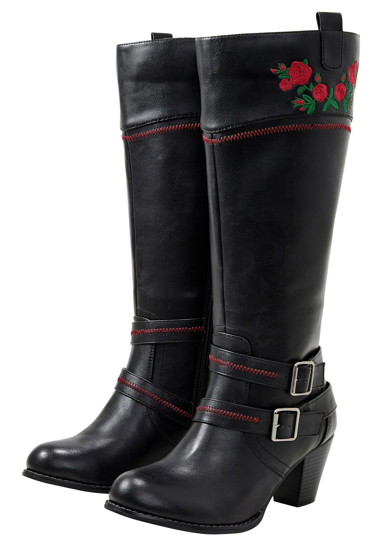 Weitschaftstiefel aus Lederimitat von sheego by Joe Browns mit leichter Profilsohle. Mit abgerundeter Spitze und markantem Absatz zeigen sie sich im femininen Cowboy-Style. Einen dekorativen Akzent setzt die Blumenstickerei an der Schaftaußenseite, die durch Kontrastnähte ergänzt wird. Die Schnallen sind nicht nur ein modisches Stilelement, sondern lassen sich in der Weite verstellen und sorgen zusammen mit dem breiten Stretcheinsatz hinten für Bequemlichkeit. Ein Reißverschluss an der Schaftinnenseite sowie eine kleine seitliche Zugschlaufe erleichtern das Anziehen.